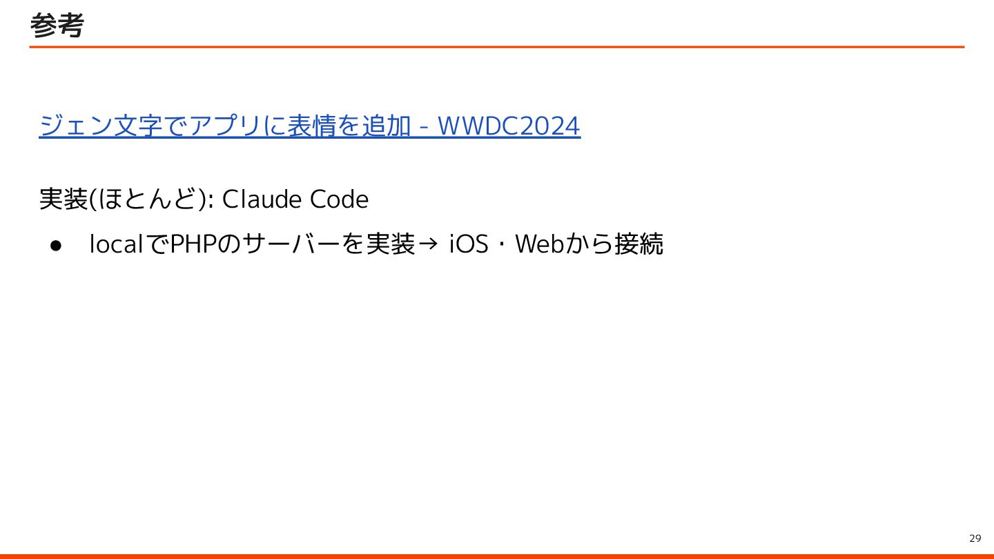 29 参考 ジェン文字でアプリに表情を追加 - WWDC2024 実装(ほとんど): Claude Code • localでPHPのサーバーを実装→