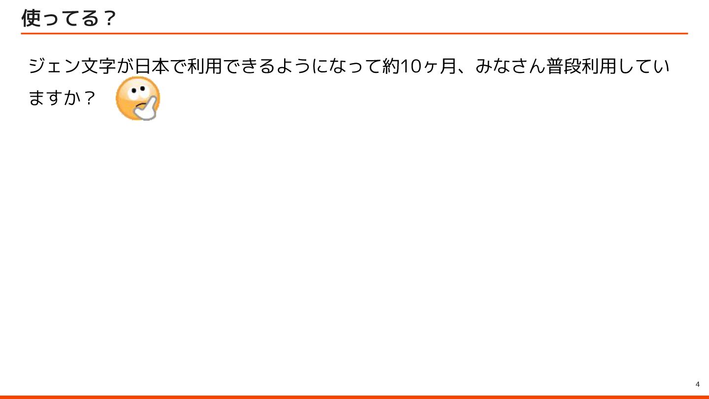 4 使ってる? ジェン文字が日本で利用できるようになって約10ヶ月、みなさん普段利用してい ますか?