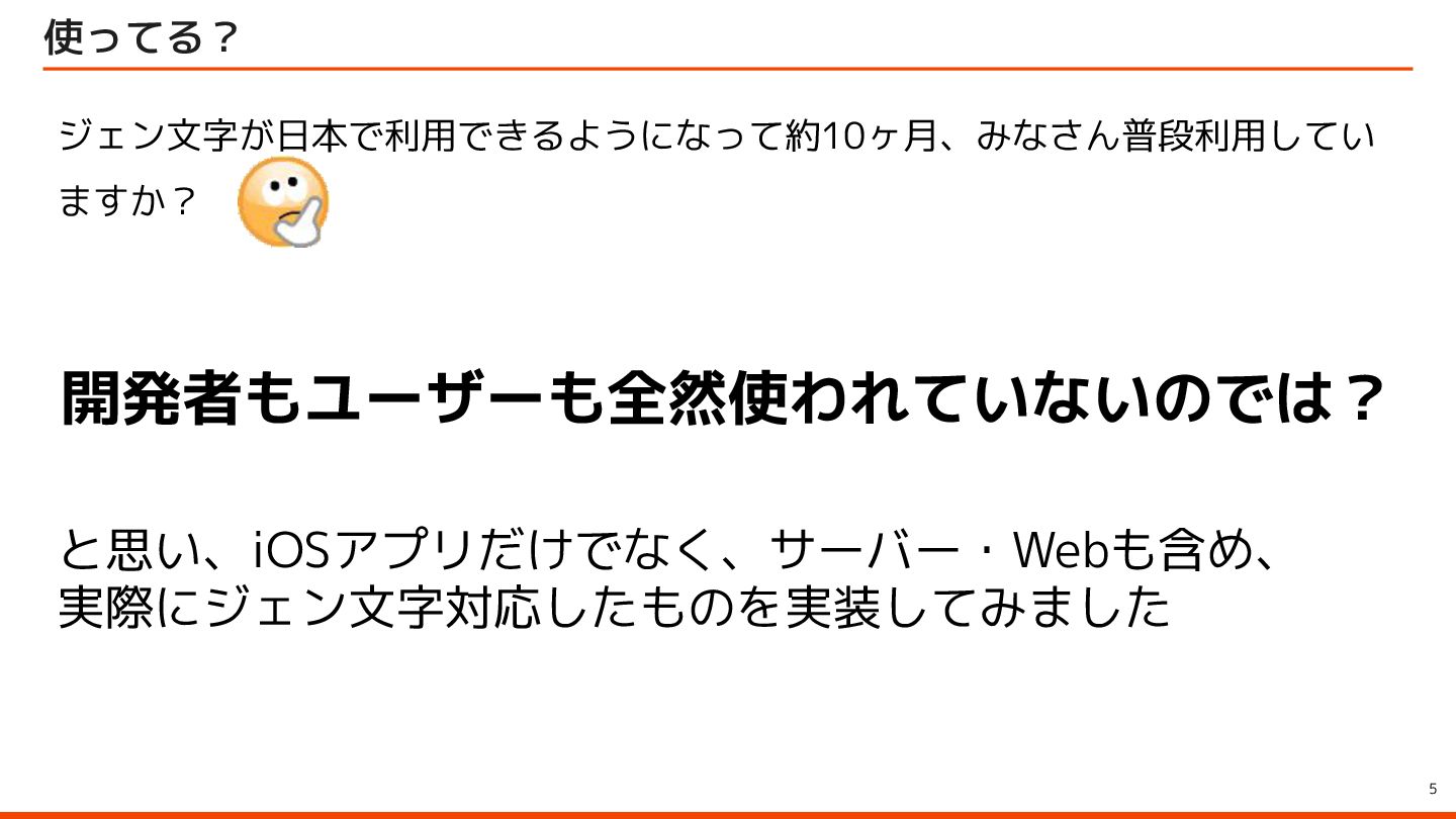 5 使ってる? ジェン文字が日本で利用できるようになって約10ヶ月、みなさん普段利用してい ますか? 開発者もユーザーも全然使われていないのでは? と思い、iOSアプリだけでなく、サーバー・Webも含め、 実際にジェン文字対応したものを実装してみました