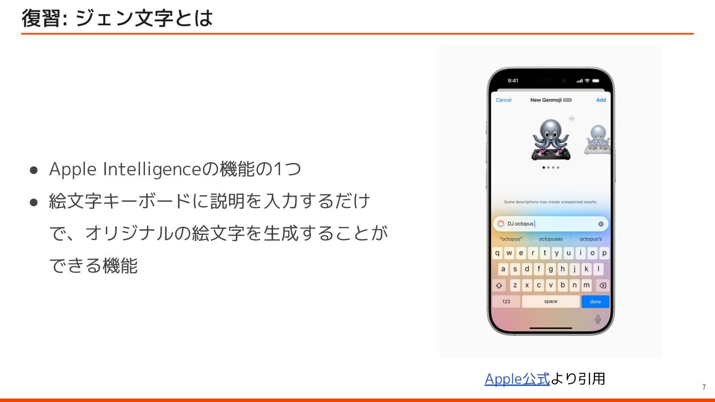 復習: ジェン文字とは • Apple Intelligenceの機能の1つ • 絵文字キーボードに説明を入力するだけ で、オリジナルの絵文字を生成することが できる機能 7