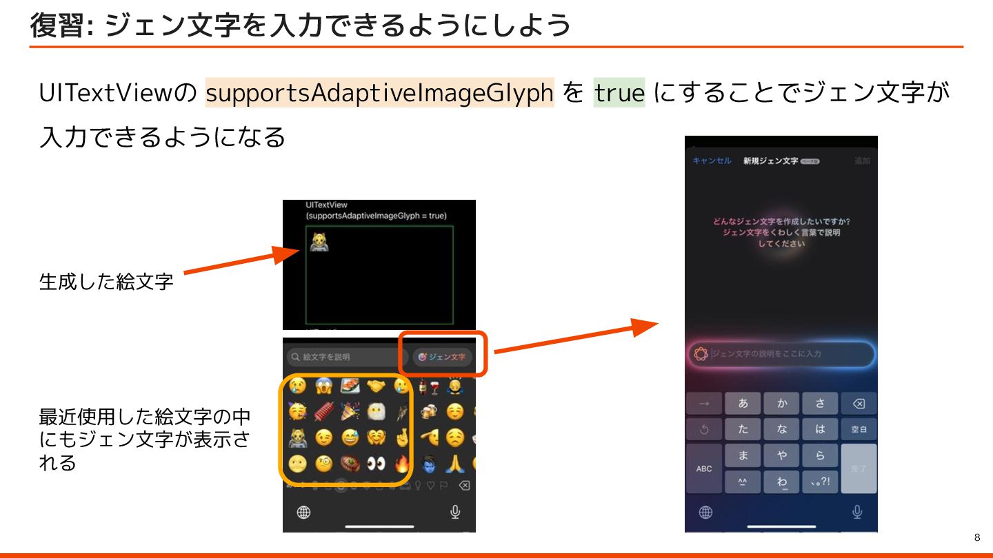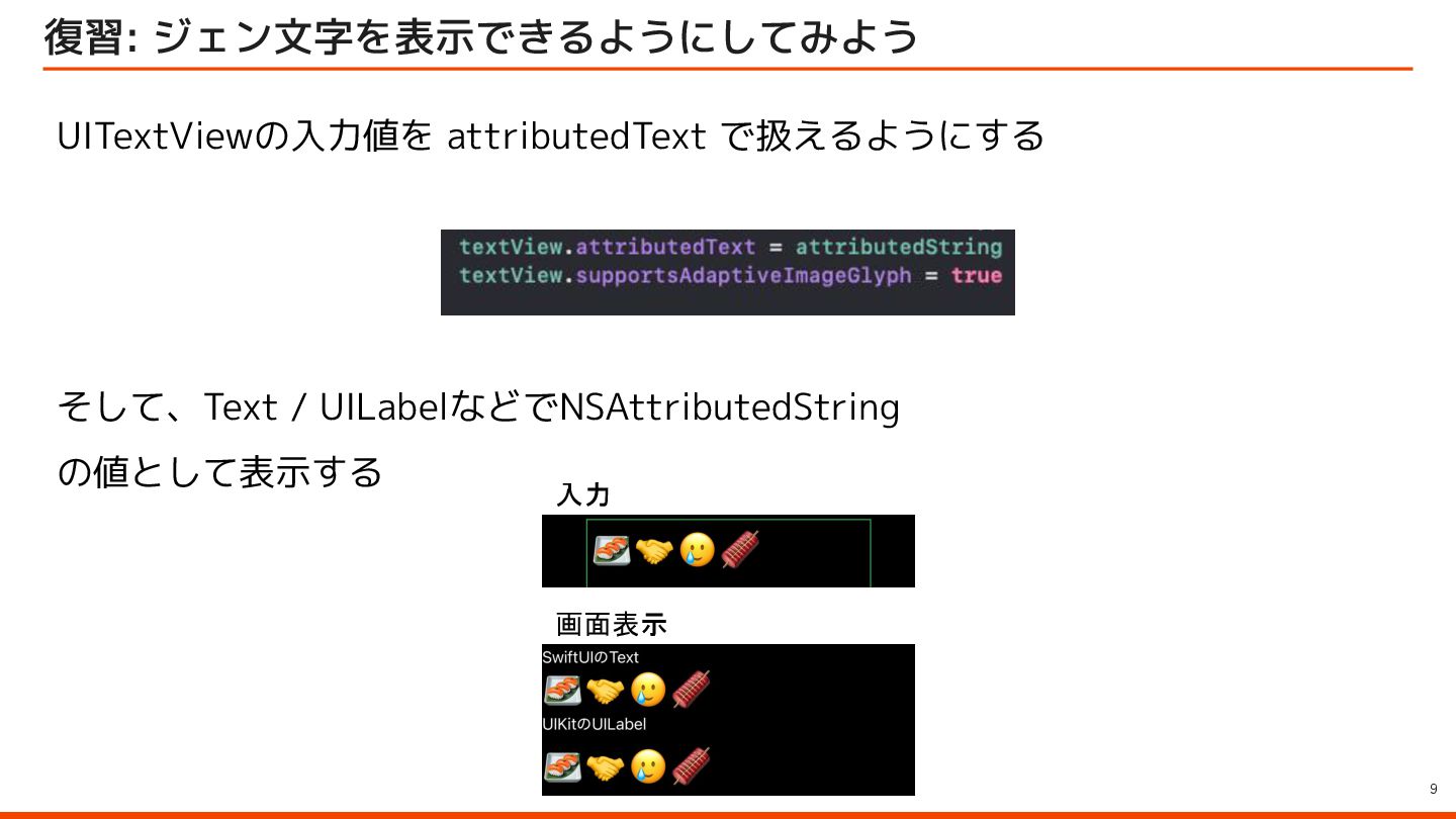 8 復習: ジェン文字を入力できるようにしよう UITextViewの supportsAdaptiveImageGlyph を true にすることでジェン文字が 入力できるようになる 生成した絵文字