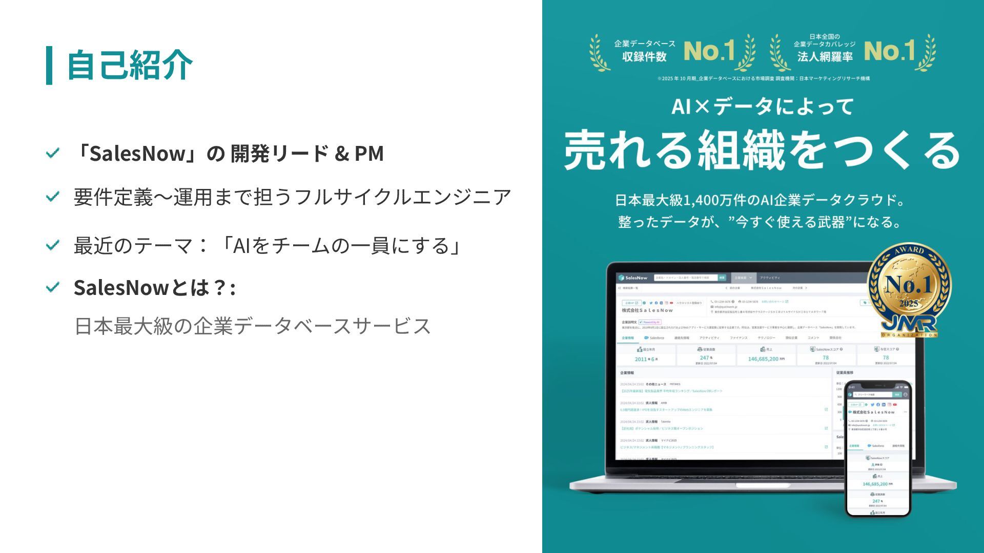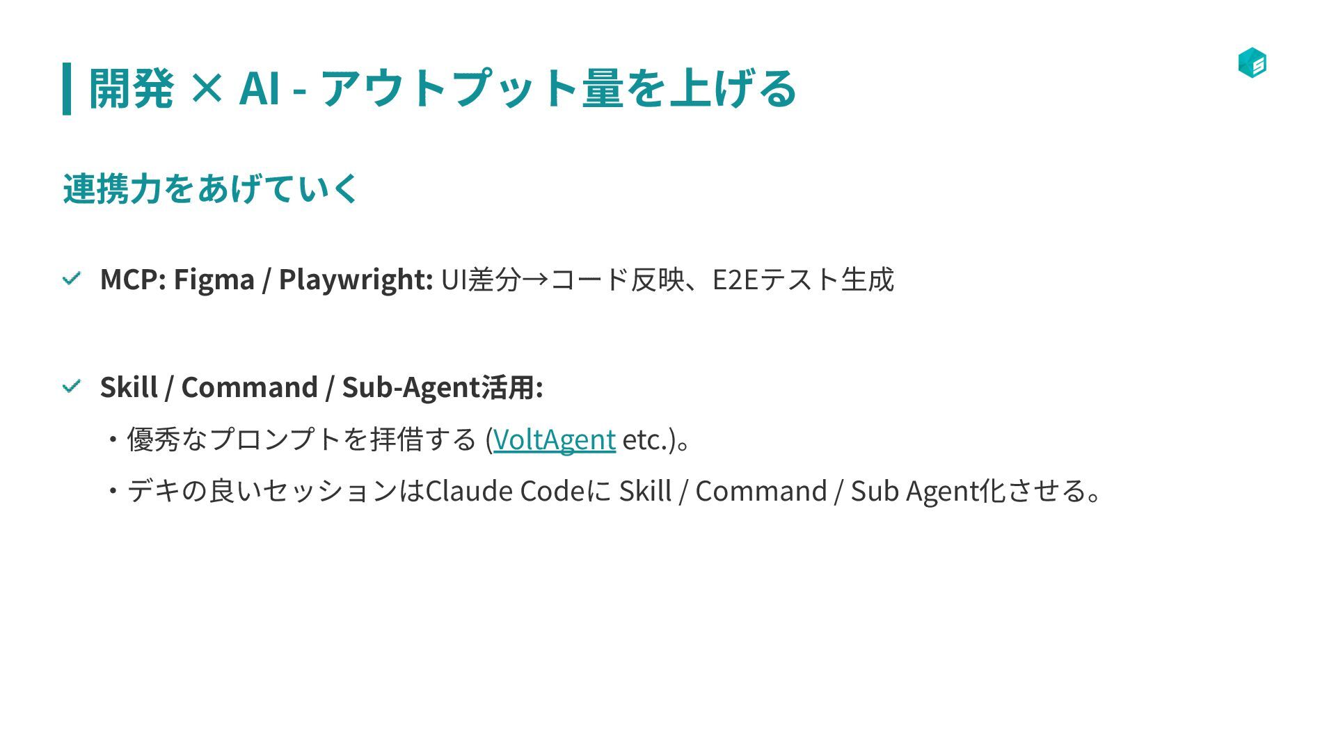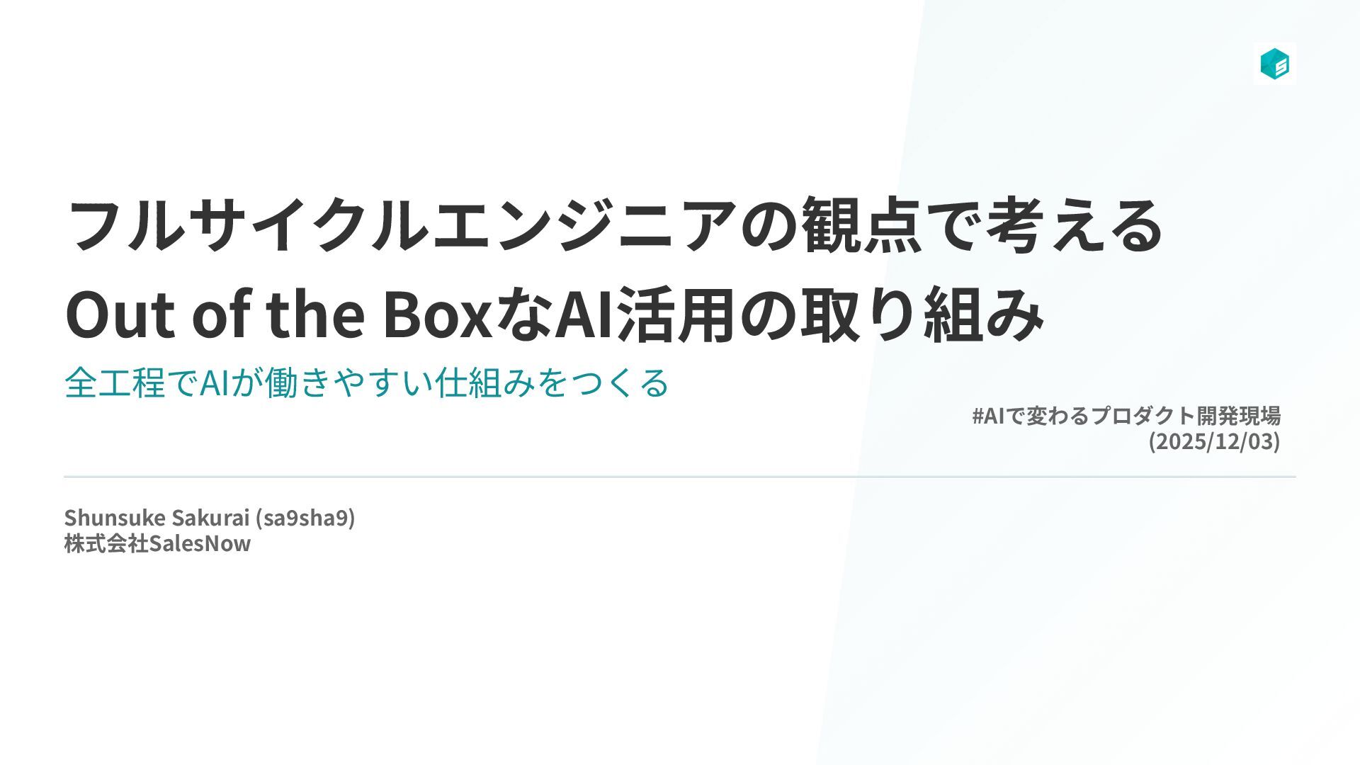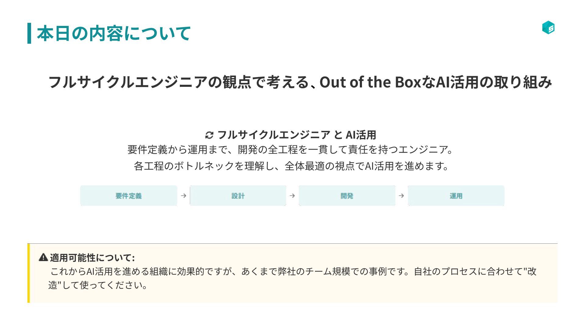 フルサイクルエンジニアの視点から、開発の全工程(要件定義から運用まで)におけるAI活用の実践的なノウハウをまとめた技術LT用スライド生成プロンプト。