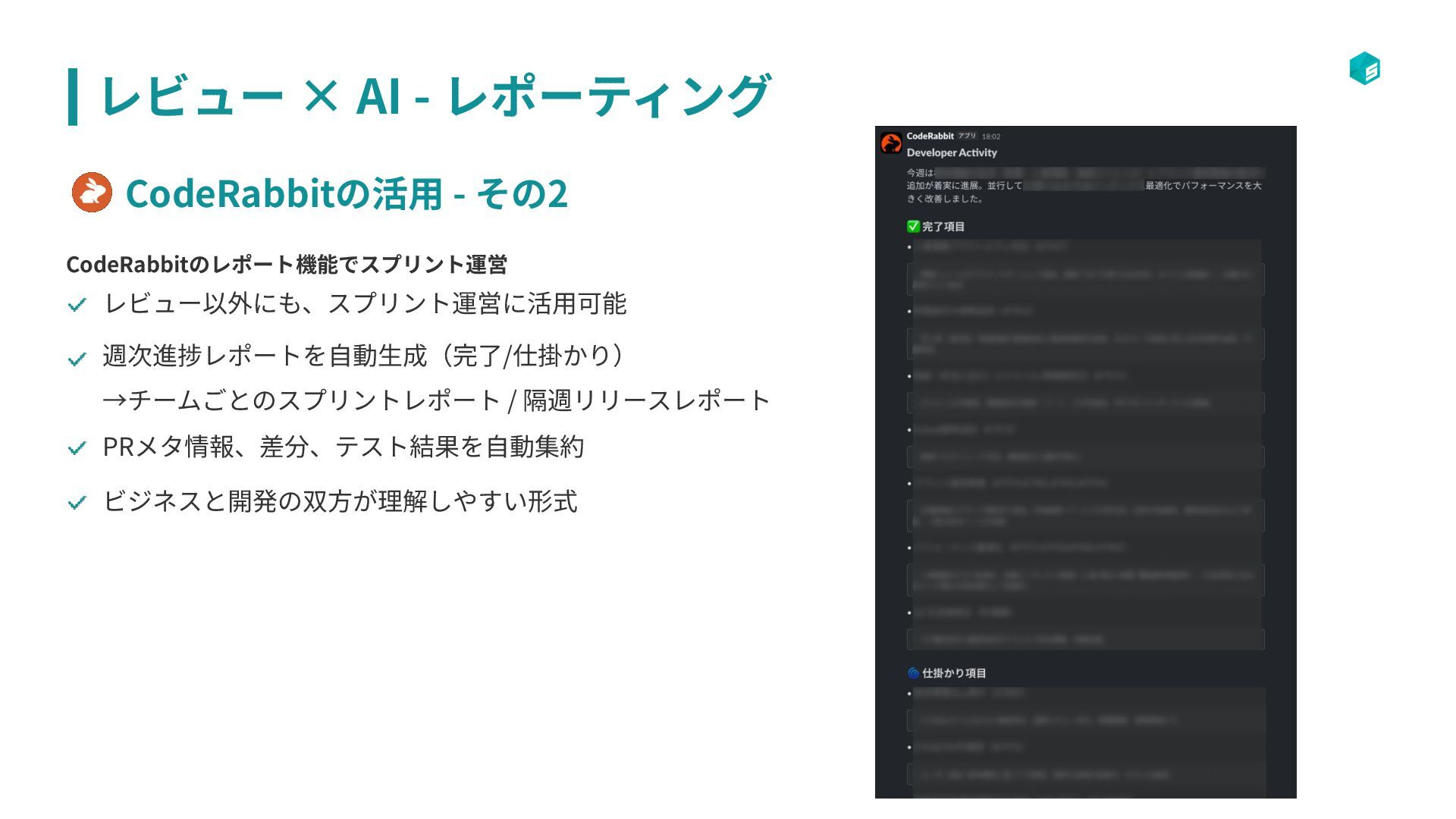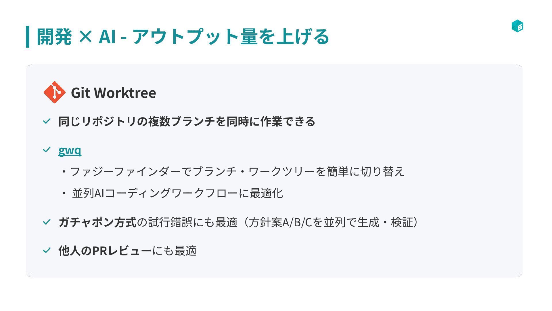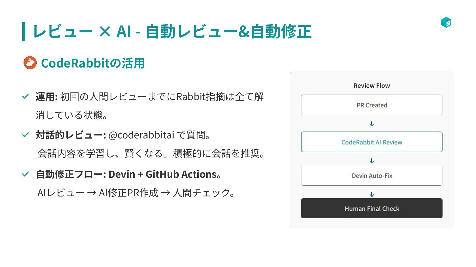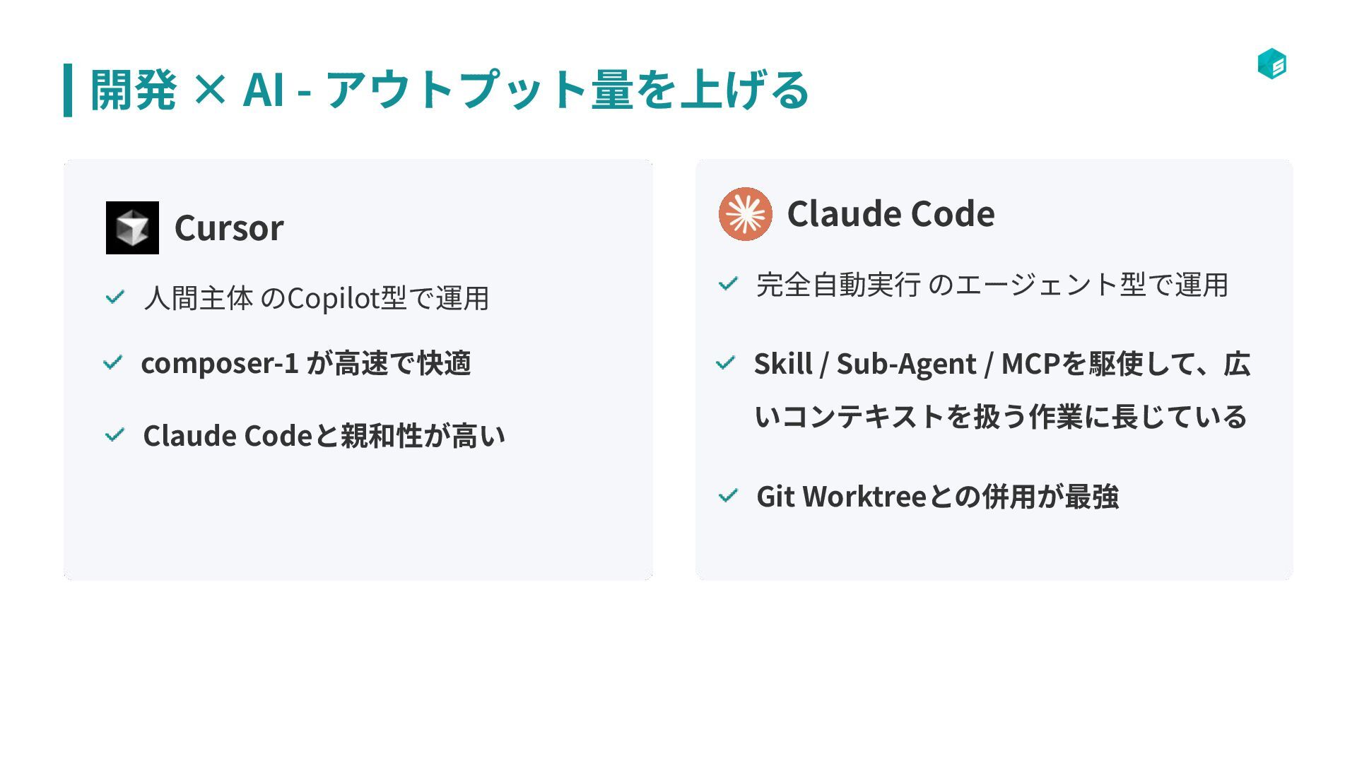 Cursor/Claude Codeの使い分け、CodeRabbitでのレビュー自動化、Git Worktreeでの並列開発、運用からのフィードバックループ構築など、現場で使える具体的なTipsを工程順に紹介。