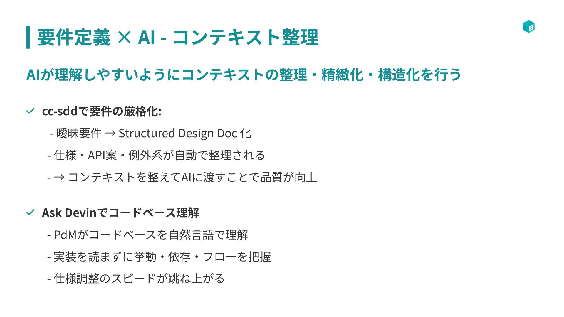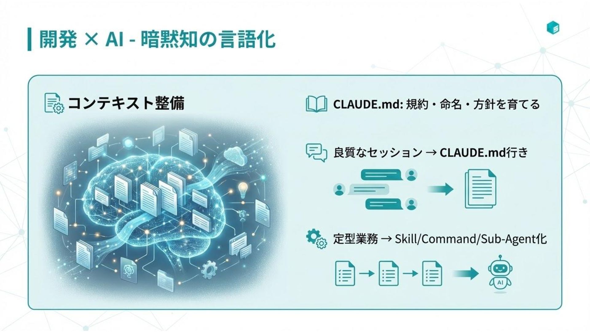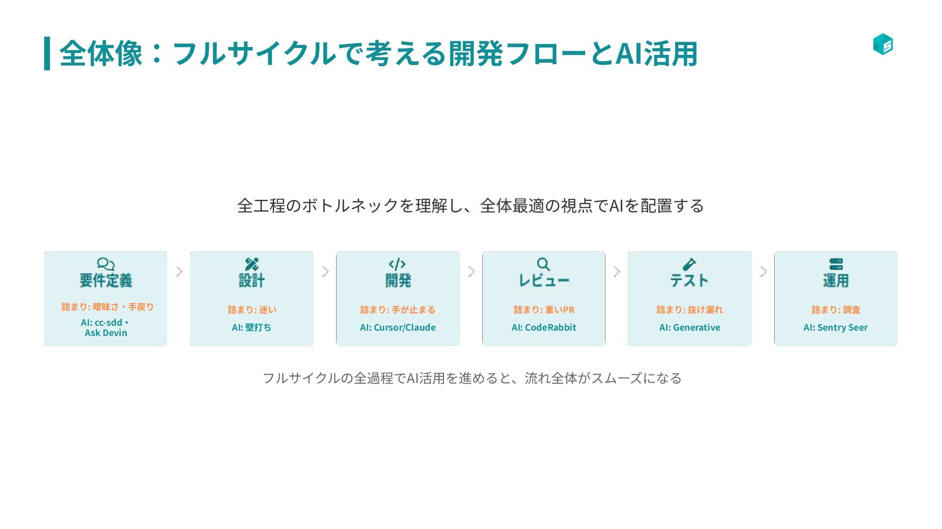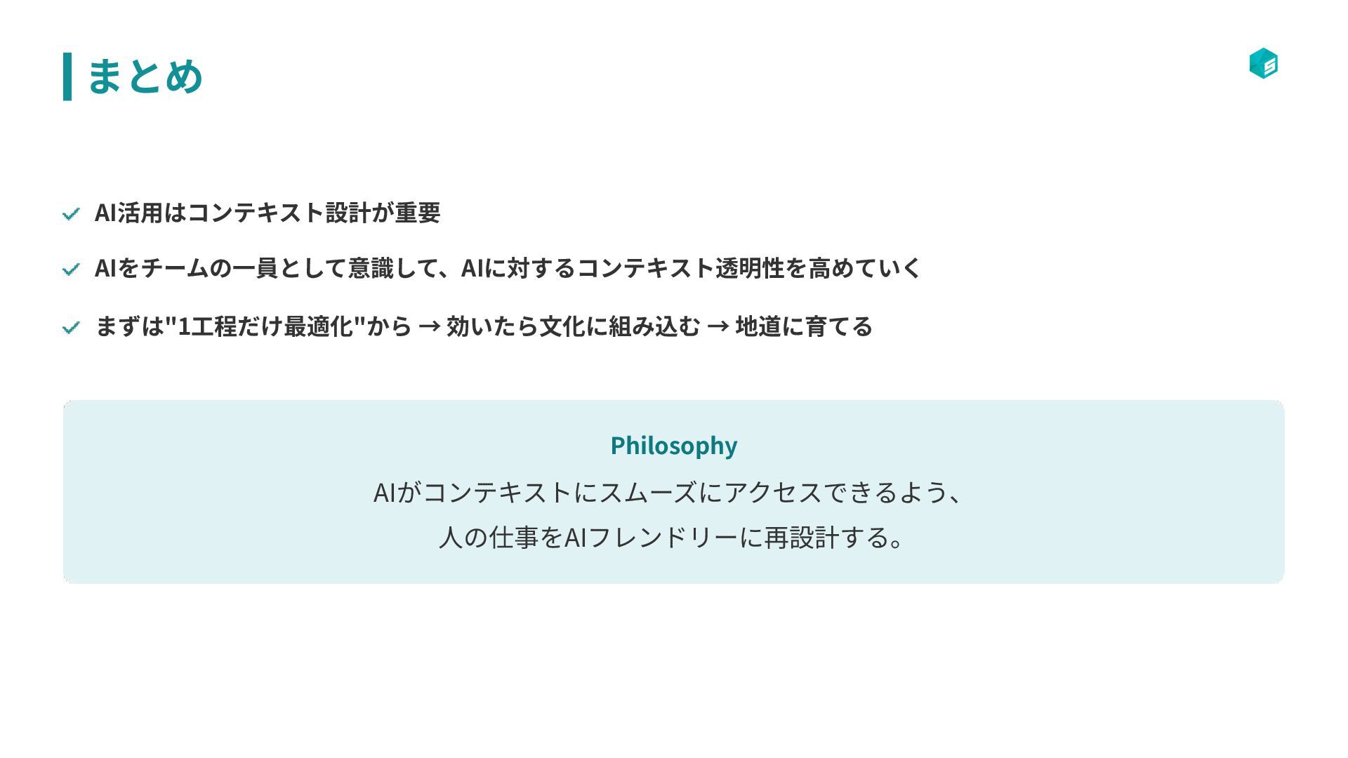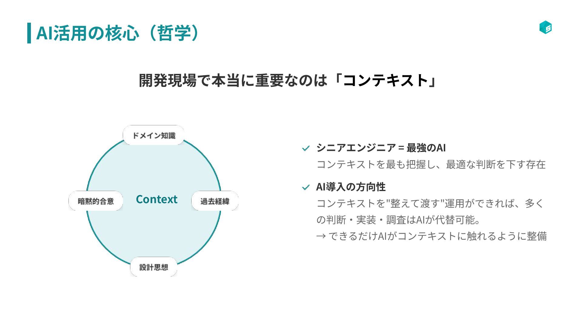 AI活用の本質は「コンテキストを整えて渡す」ことにあり、各フェーズのボトルネックをAIで支援することで、チーム全体の生産性を向上させる。