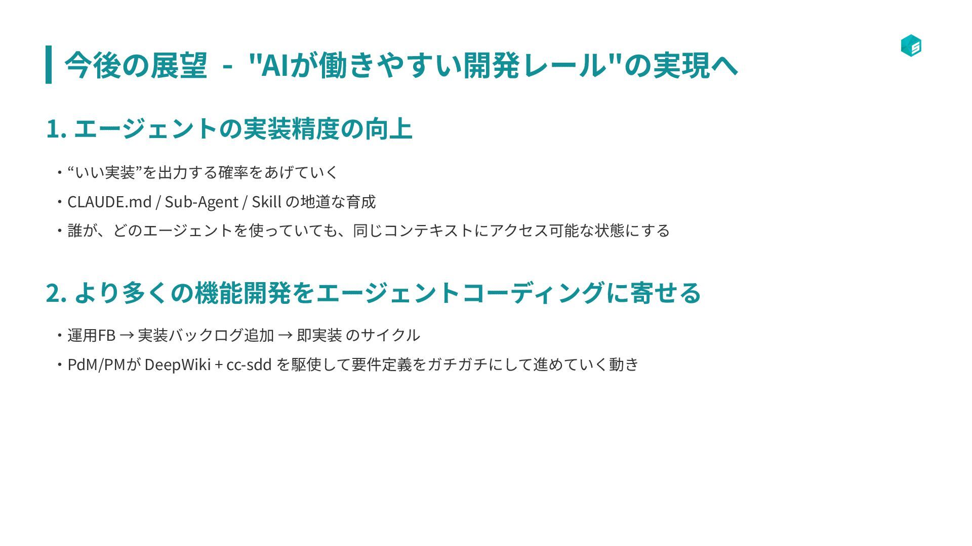 AIと人間の役割分担を明確にし、コンテキストのI/Oを整備することで「AIが動きやすい開発組織」を実現する方向性を示す。