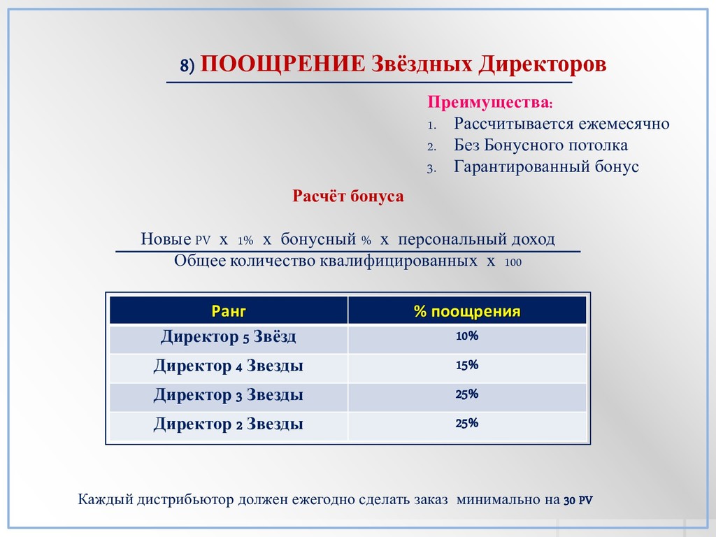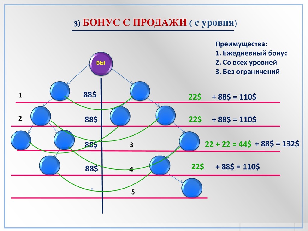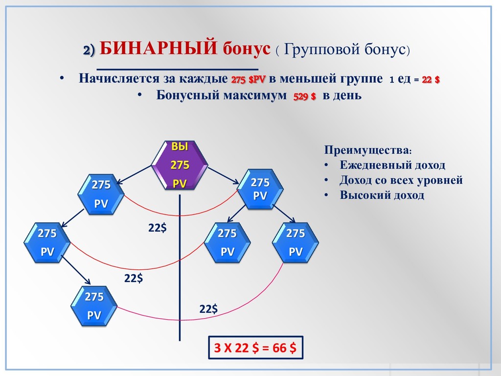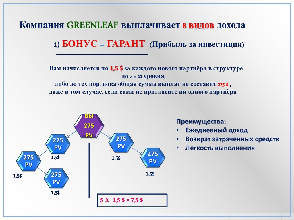 (Прибыль за инвестиции) Вам начисляется по 1,5 $ за каждого нового партнёра в структуре до < = 20 уровня, либо до тех пор, пока общая сумма выплат не составит 275 $ , даже в том случае, если сами не пригласите ни одного партнёра ВЫ 275 PV 275 PV 275 PV 275 PV 275 PV 275 PV 1,5$ 1,5$ 1,5$ 1,5$ 1,5$ 5 х 1,5 $ = 7,5 $ Преимущества: • Ежедневный доход • Возврат затраченных средств • Легкость выполнения
