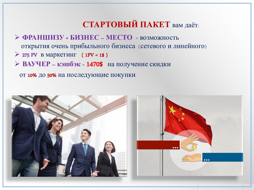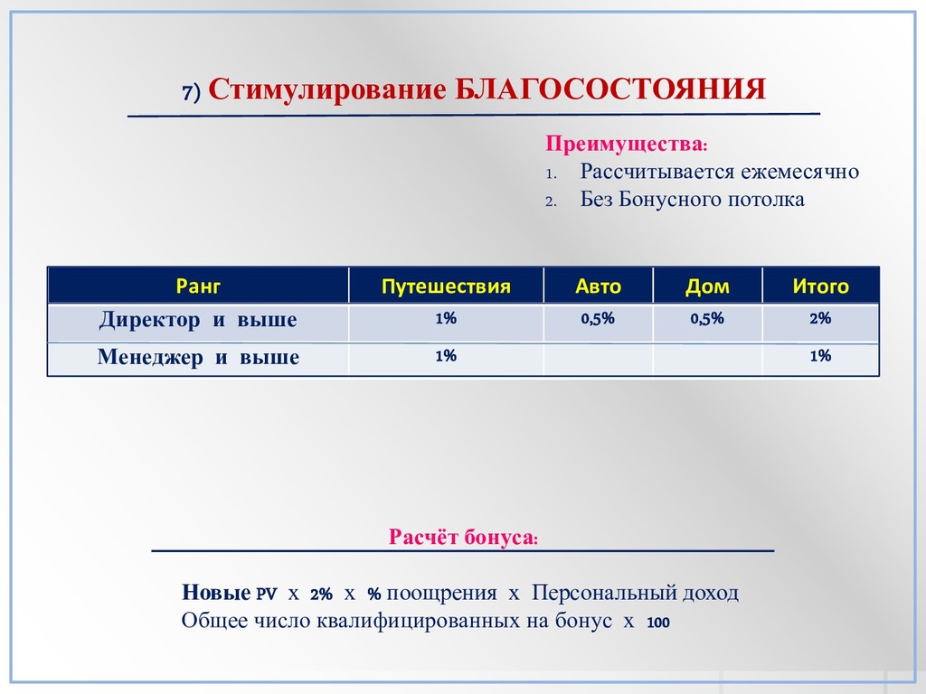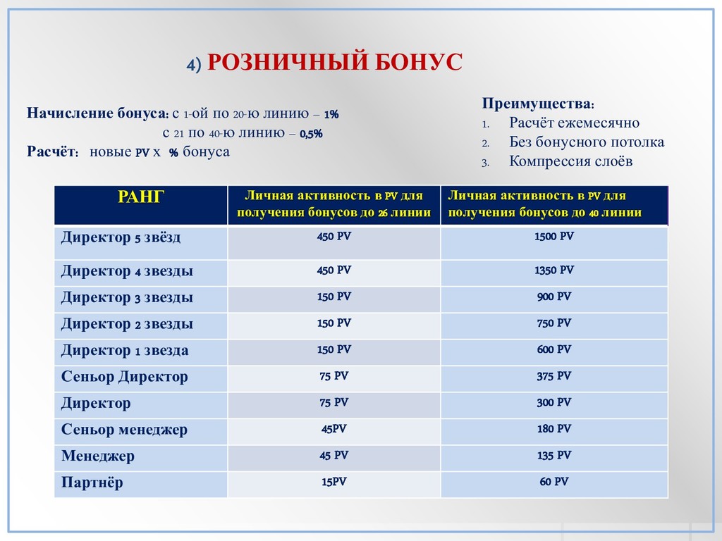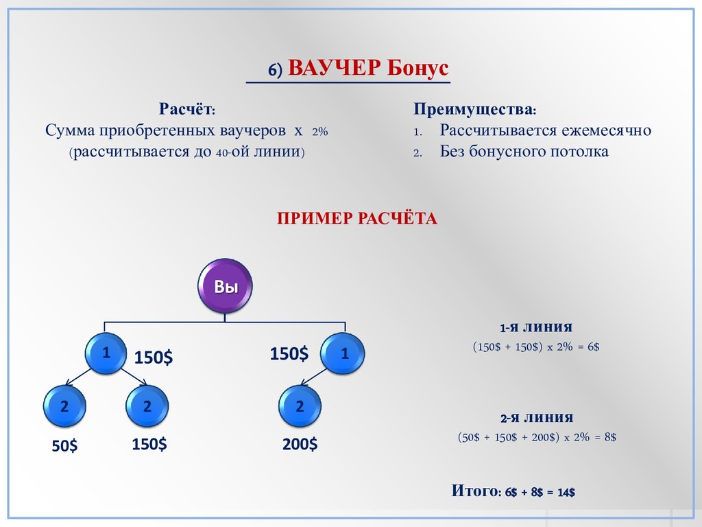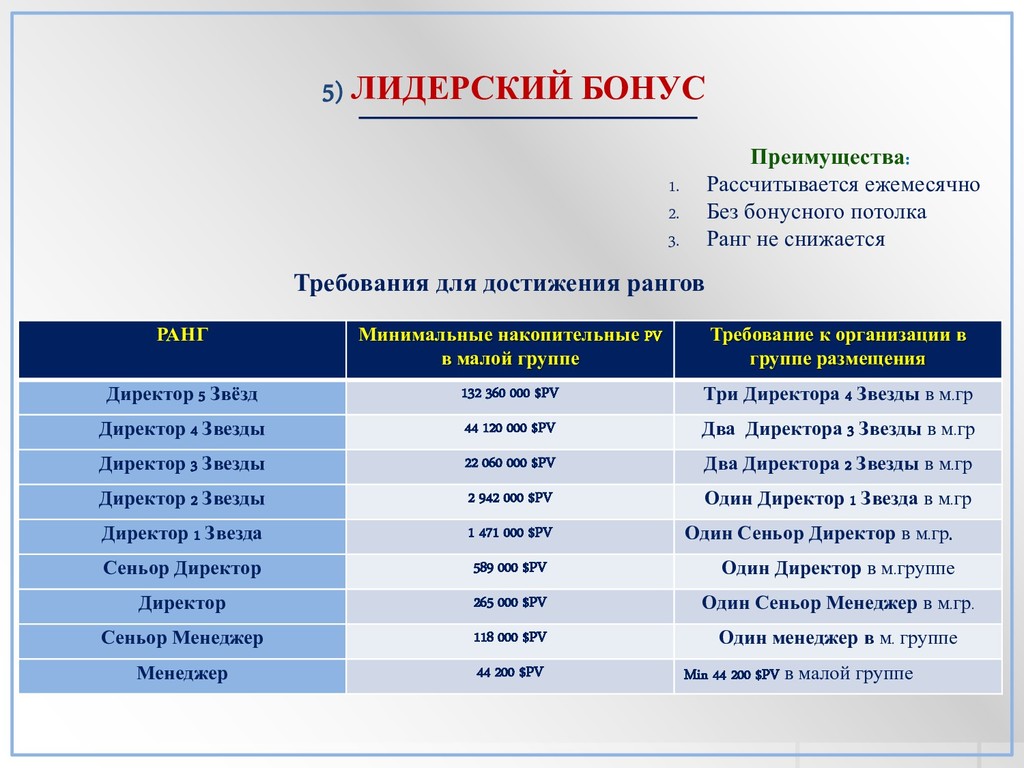 (Прибыль за инвестиции) Вам начисляется по 1,5 $ за каждого нового партнёра в структуре до < = 20 уровня, либо до тех пор, пока общая сумма выплат не составит 275 $ , даже в том случае, если сами не пригласите ни одного партнёра ВЫ 275 PV 275 PV 275 PV 275 PV 275 PV 275 PV 1,5$ 1,5$ 1,5$ 1,5$ 1,5$ 5 х 1,5 $ = 7,5 $ Преимущества: • Ежедневный доход • Возврат затраченных средств • Легкость выполнения