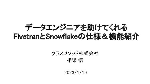 「こんなことまでしてくれるの!?~データエンジニアを助けてくれるFivetranとSnowflake~」で発表した登壇資料です。 https://dev.classmethod.jp/news/230119_fivetran-snowflake