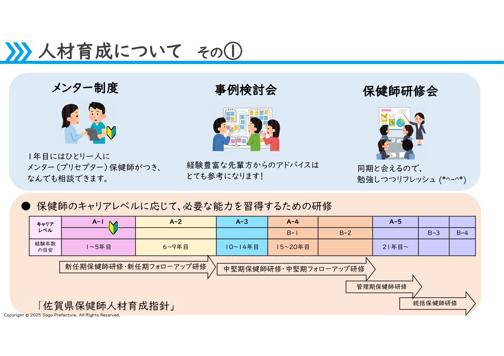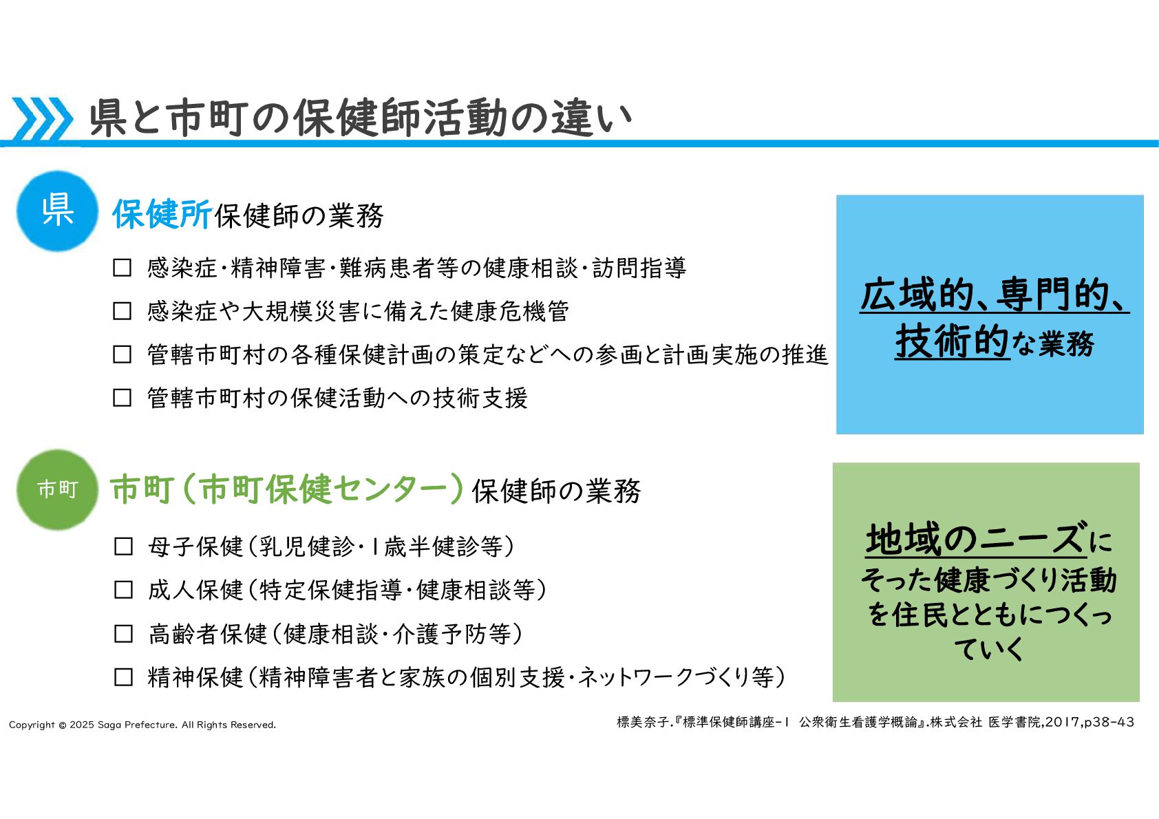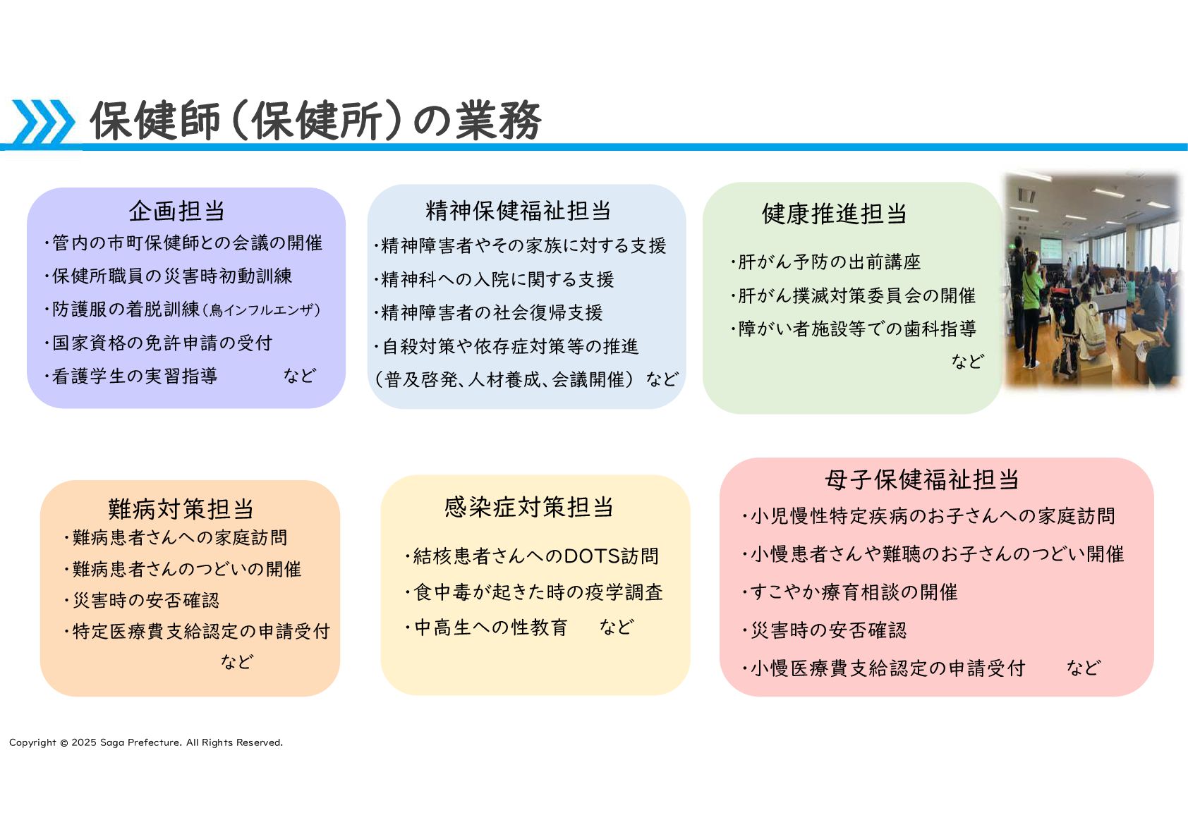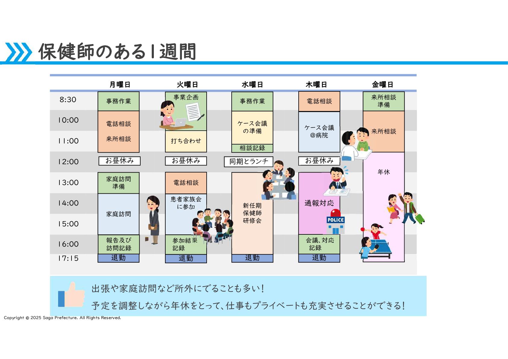 14:00 15:00 16:00 17:15 退勤 事務作業 電話相談 来所相談 お昼休み 家庭訪問 準備 家庭訪問 報告及び 訪問記録 患者家族会 に参加 退勤 参加結果 記録 お昼休み 電話相談 事業企画 打ち合わせ 退勤 同期とランチ 新任期 保健師 研修会 事務作業 ケース会議 の準備 相談記録 年休 来所相談 準備 来所相談 通報対応 退勤 会議、対応 記録 お昼休み ケース会議 @病院 電話相談 保健師のある1週間 出張や家庭訪問など所外にでることも多い! 予定を調整しながら年休をとって、仕事もプライベートも充実させることができる! Copyright © 2025 Saga Prefecture. All Rights Reserved.
