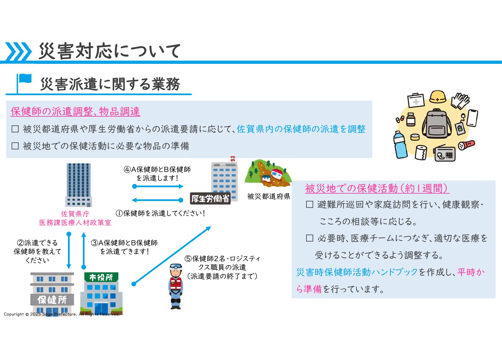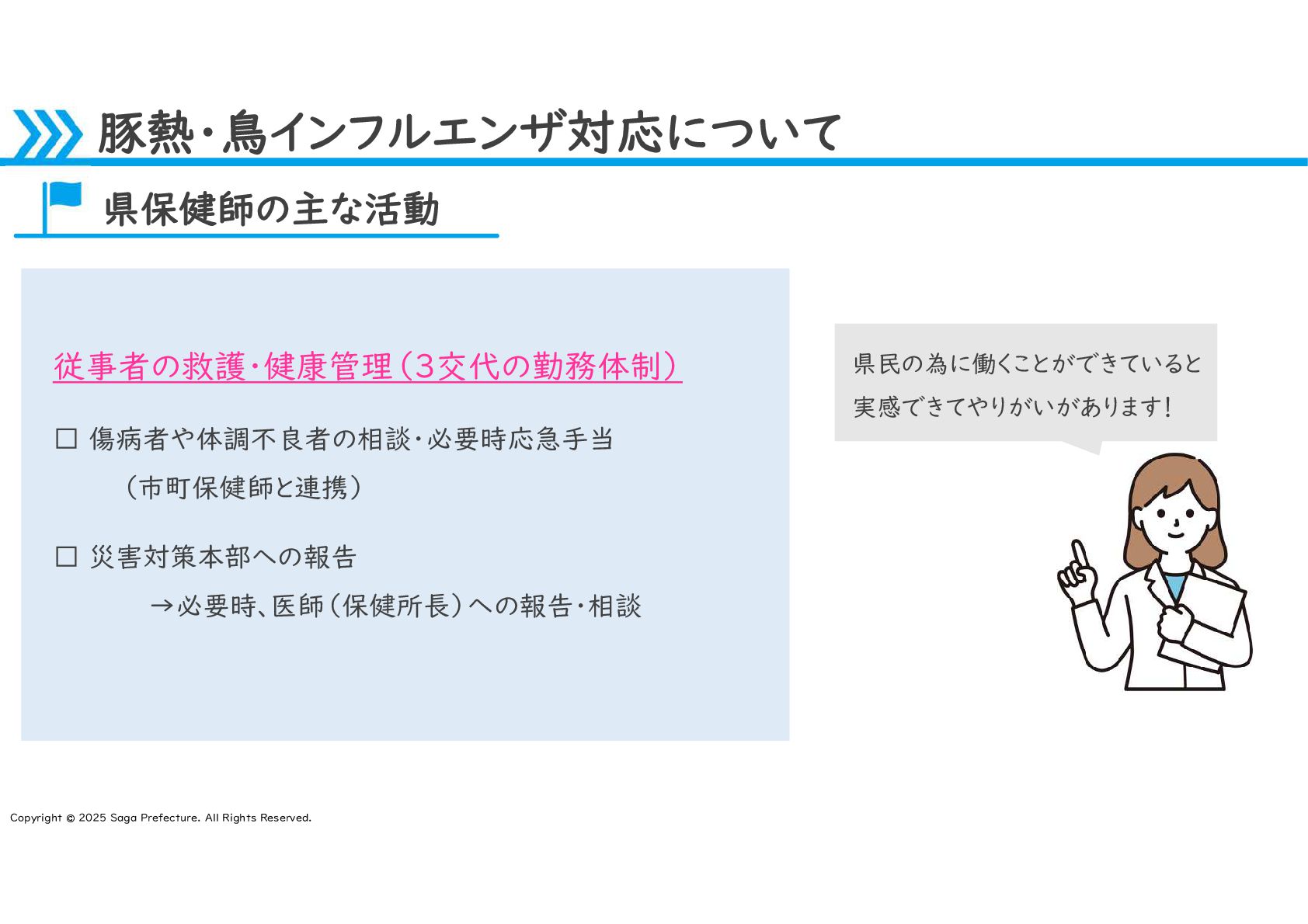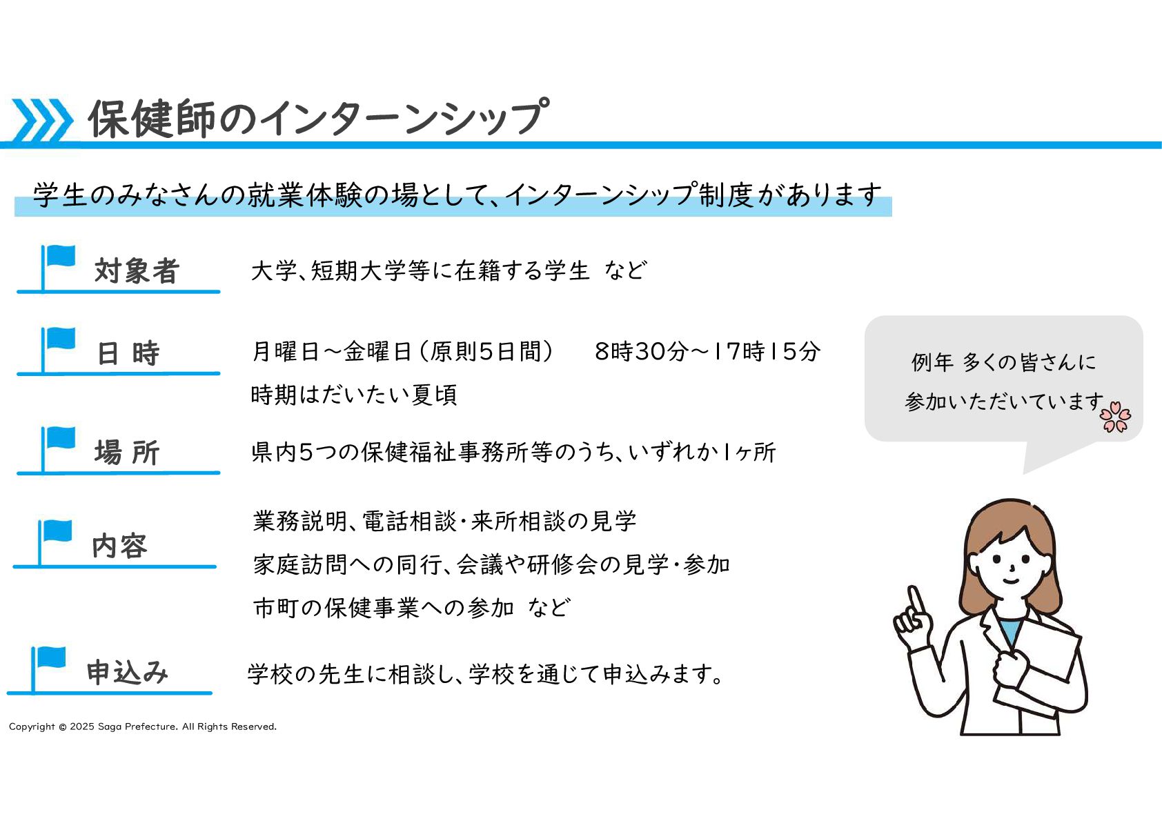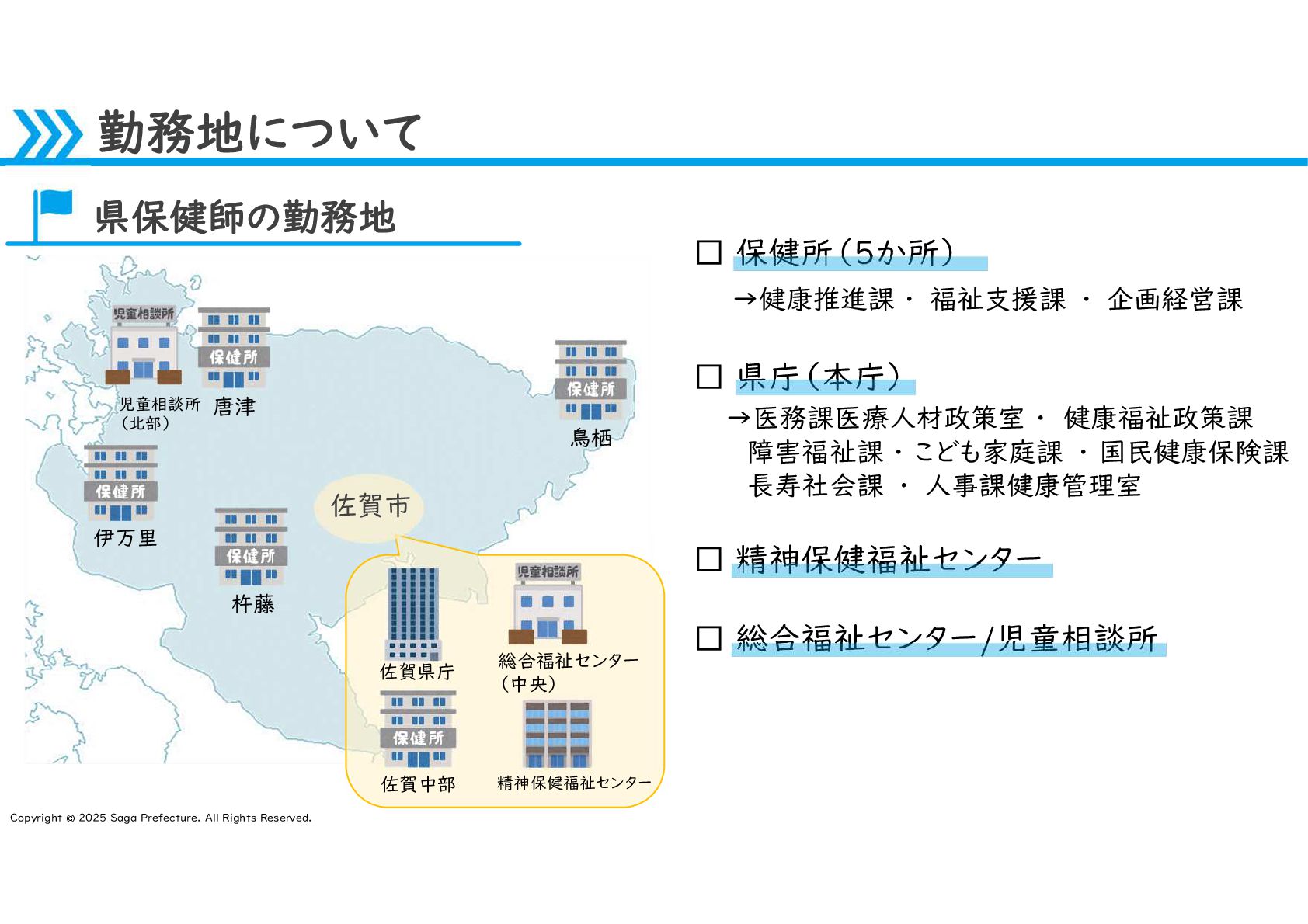 14:00 15:00 16:00 17:15 退勤 事務作業 電話相談 来所相談 お昼休み 家庭訪問 準備 家庭訪問 報告及び 訪問記録 患者家族会 に参加 退勤 参加結果 記録 お昼休み 電話相談 事業企画 打ち合わせ 退勤 同期とランチ 新任期 保健師 研修会 事務作業 ケース会議 の準備 相談記録 年休 来所相談 準備 来所相談 通報対応 退勤 会議、対応 記録 お昼休み ケース会議 @病院 電話相談 保健師のある1週間 出張や家庭訪問など所外にでることも多い! 予定を調整しながら年休をとって、仕事もプライベートも充実させることができる! Copyright © 2025 Saga Prefecture. All Rights Reserved.