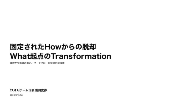 2023/9/15 Fri. TAM AIチーム代表 佐川史弥 柔軟かつ無理のない、ワークフローの持続的な改善 固定されたHowからの脱却 What起点のTransformation
