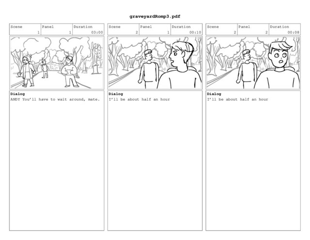to wait around, mate. Scene 2 Panel 1 Duration 00:10 Dialog I’ll be about half an hour Scene 2 Panel 2 Duration 00:08 Dialog I’ll be about half an hour graveyardRomp3.pdf