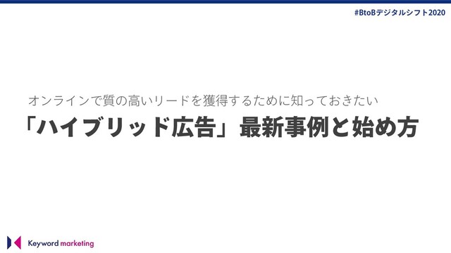 ハイブリッド 資料DL・セミナー申し込み お役立ち資料(テーマ狭め)・セミナー ③ 種まき 資料DL・メルマガ登録・サイト接触 お役立ち資料(テーマ広め)・ブログ記事 ④ 認知 動画の再生・広告の視認数 短尺のサービス紹介動画など Copyright KeywordMarketing Inc. All rights reserved. No reproduction without permission. Web 広告は、上から順番に実施していきましょう