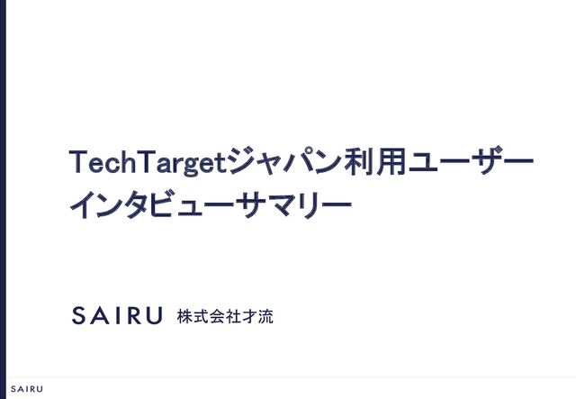 l 新しく出てきたキーワード(「ゼロトラスト」など)はチェックして勉強している l セキュリティポリシーなど各社で考え方が異なる事項は参考になることが多い 3.利用方法 l TOPページをブックマークしており、スマホで朝食を食べながら毎日見ている l 新着記事、新着ホワイトペーパーの中から気になったコンテンツを閲覧 l 検討フェーズでは、サイト内検索を使うこともある l 稟議資料に記事やホワイトペーパーを引用することがある 4.購入までの経験 l セキュリティサービスに関する情報収集において、購入までつながった経験がある l TechTargetジャパンで事例や用語解説コンテンツを閲覧して興味をもち、その後ベンダーサイトで問い合わせ 5.閲覧後の行動 l 興味がある製品・サービスはベンダーサイトで問い合わせをする l ホワイトペーパーをダウンロードしたタイミングだと、要件が決まっていないことが多く、アプローチされても困る l メルマガはよく読むタイプなので、もらえると嬉しい。ウェビナー参加や問い合わせをすることもある 6.情報収集の方法 l 「日経クロステック」、「クラウド Watch(インプレス)」を閲覧している l 「情シスSlack」で情報収集することも多い。検索して過去の質問の回答などを閲覧 l コロナ前は展示会やセミナーに参加していたが、最近は行っていない 中小ITサービスベンダーの情報システム担当