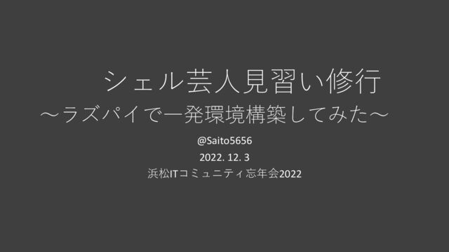 シェル芸人見習い修行 〜ラズパイで一発環境構築してみた〜 @Saito5656 2022. 12. 3 浜松ITコミュニティ忘年会2022