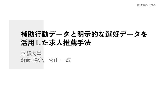 DEIM2022 C24-5 補助行動データと明示的な選好データを 活用した求人推薦手法 京都大学 斎藤 陽介,杉山 一成