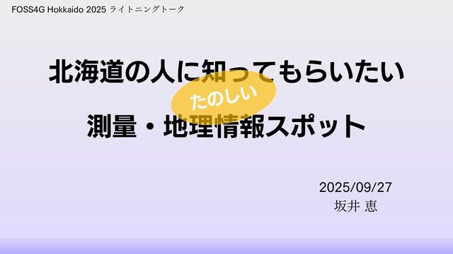 2025年9月27日に札幌で開催された FOSS4G Hokkaido 2025 の懇親会LTで発表した資料です。5分とは思えない枚数の多さですが、じっくりお楽しみいただければ幸いです。