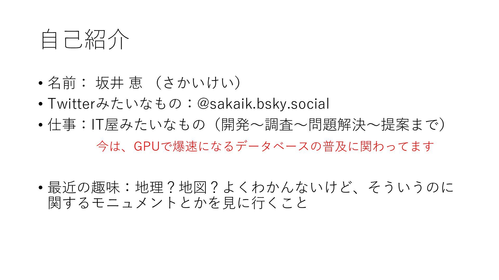 今は、GPUで爆速になるデータベースの普及に関わってます • 最近の趣味:地理?地図?よくわかんないけど、そういうのに 関するモニュメントとかを見に行くこと