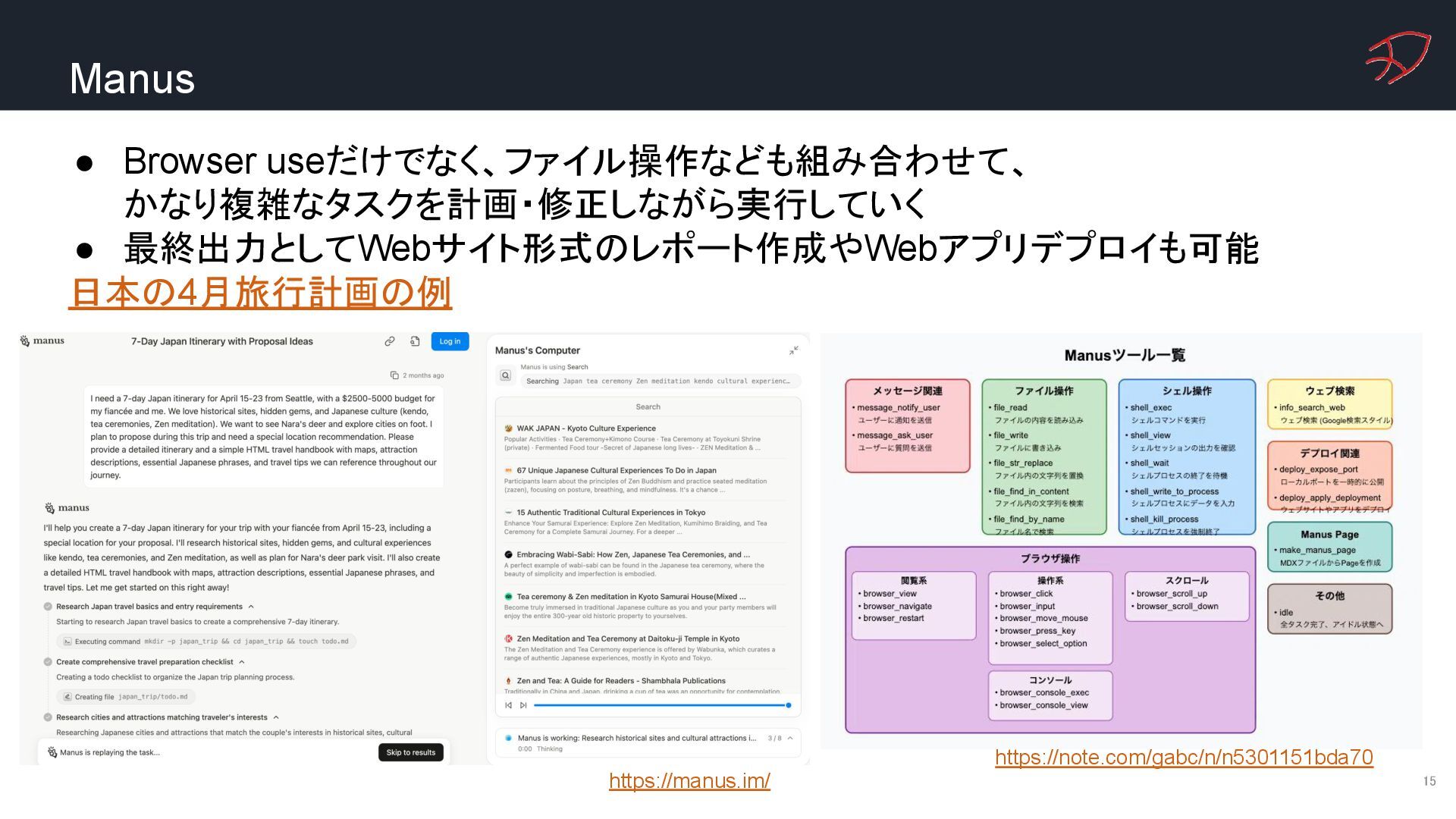 OpenAI Deep Research 商用 深い ✔ Web Search Google Deep Research 商用 中 Web Search Perplexity Deep Research 商用 中 ✔ Web Search, Programming Manus 商用 深い ✔? ✔ Browser use, Programming nickscamera/ open-deep-research OSS 浅い〜中 Web Search lanchain-ai/ open_deep_research OSS 浅い〜中 Web Search dzhng/deep-research OSS 浅い〜中 Web Search