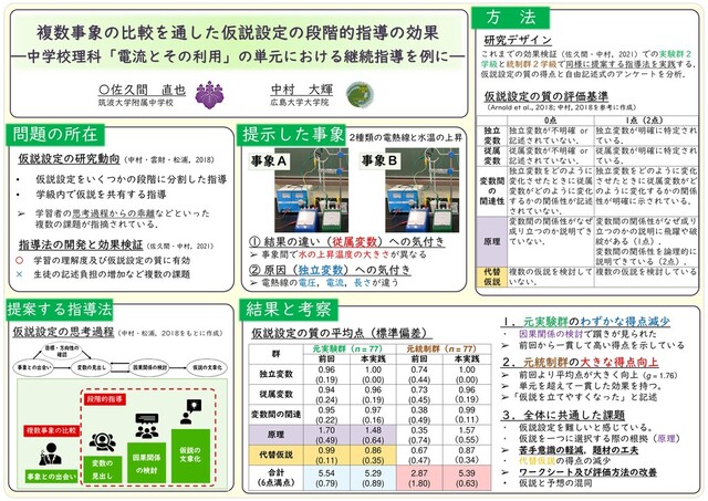 方 法 研究デザイン 中村 大輝 広島大学大学院 仮説設定の質の評価基準 (Arnold et al., 2018; 中村, 2018を参考に作成) これまでの効果検証(佐久間・中村,2021)での実験群2 学級と統制群2学級で同様に提案する指導法を実践する. 仮説設定の質の得点と自由記述式のアンケートを分析. 0点 1点(2点) 独立 変数 独立変数が不明確 or 記述されていない. 独立変数が明確に特定され ている. 従属 変数 従属変数が不明確 or 記述されていない. 従属変数が明確に特定され ている. 変数間 の 関連性 独立変数をどのように 変化させたときに従属 変数がどのように変化 するかの関係性が記述 されていない. 独立変数をどのように変化 させたときに従属変数がど のように変化するかの関係 性が明確に示されている. 原理 変数間の関係性がなぜ 成り立つのか説明でき ていない. 変数間の関係性がなぜ成り 立つのかの説明に飛躍や破 綻がある(1点). 変数間の関係性を論理的に 説明できている(2点). 代替 仮説 複数の仮説を検討して いない. 複数の仮説を検討している. ➢ 学習者の思考過程からの乖離などといった 複数の課題が指摘されている. ① 結果の違い(従属変数)への気付き ➢ 事象間で水の上昇温度の大きさが異なる 結果と考察 ② 原因(独立変数)への気付き ➢ 電熱線の電圧,電流,長さが違う 事象A 事象B 仮説設定の思考過程(中村・松浦,2018をもとに作成) 群 元実験群(n = 77) 元統制群(n = 77) 前回 本実践 前回 本実践 独立変数 0.96 (0.19) 1.00 (0.00) 0.74 (0.44) 1.00 (0.00) 従属変数 0.94 (0.24) 0.96 (0.19) 0.73 (0.45) 0.96 (0.19) 変数間の関連 0.95 (0.22) 0.97 (0.16) 0.38 (0.49) 0.99 (0.11) 原理 1.70 (0.49) 1.48 (0.64) 0.35 (0.74) 1.57 (0.55) 代替仮説 0.99 (0.11) 0.86 (0.35) 0.67 (0.47) 0.87 (0.34) 合計 (6点満点) 5.54 (0.79) 5.29 (0.89) 2.87 (1.80) 5.39 (0.63) 仮説設定の質の平均点(標準偏差) 1.元実験群のわずかな得点減少 ・ 因果関係の検討で躓きが見られた ➢ 前回から一貫して高い得点を示している 2.元統制群の大きな得点向上 ➢ 前回より平均点が大きく向上(g = 1.76) ➢ 単元を超えて一貫した効果を持つ。 ➢「仮説を立てやすくなった」と記述 3.全体に共通した課題 ・ 仮説設定を難しいと感じている。 ・ 仮説を一つに選択する際の根拠(原理) ➢ 苦手意識の軽減,題材の工夫 ・ 代替仮説の得点の減少 ➢ ワークシート及び評価方法の改善 ・ 仮説と予想の混同 仮説設定の研究動向(中村・雲財・松浦,2018) 指導法の開発と効果検証(佐久間・中村,2021) 〇 学習の理解度及び仮説設定の質に有効 × 生徒の記述負担の増加など複数の課題 2種類の電熱線と水温の上昇