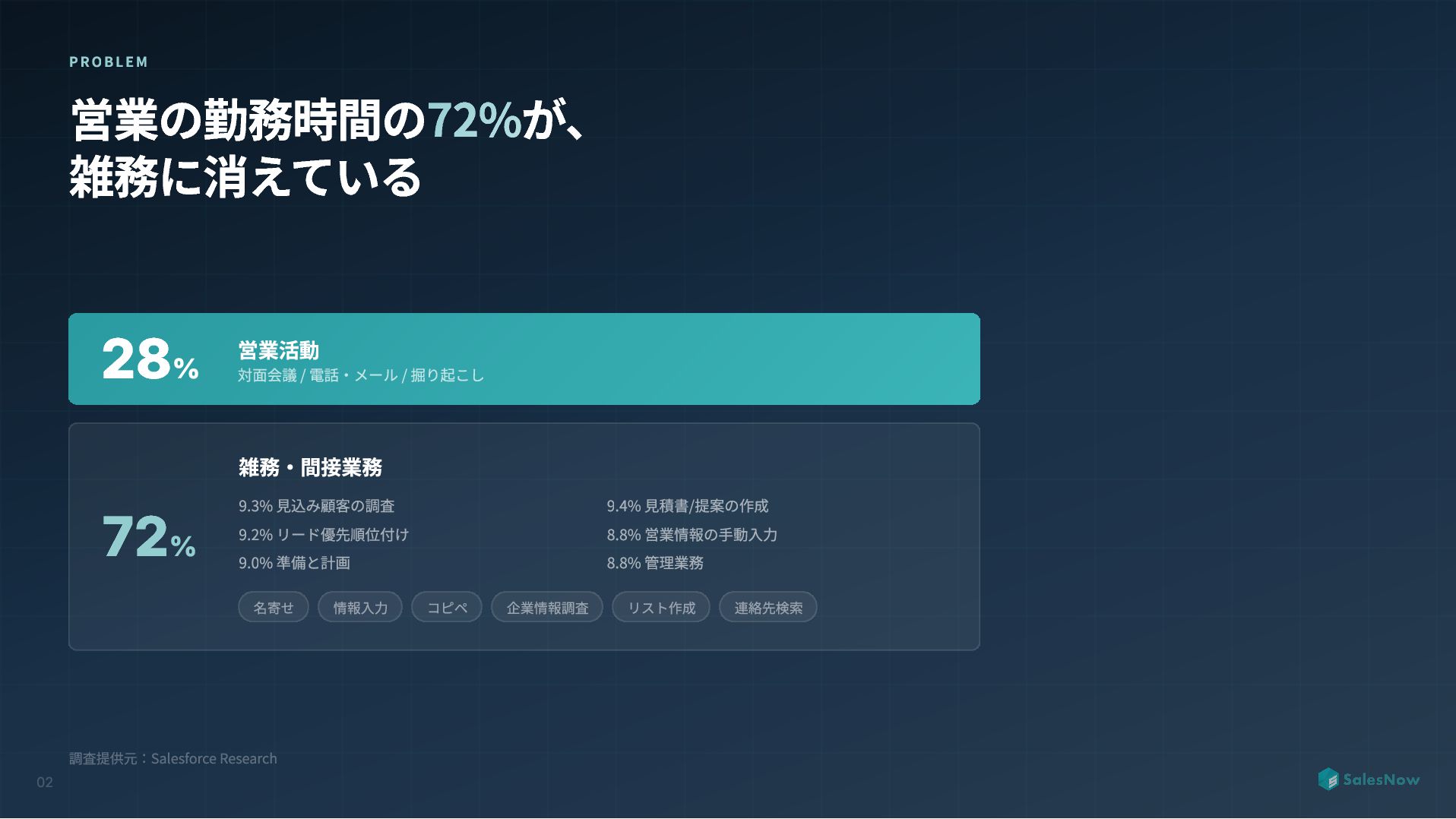 1. PROBLEM 営業の勤務時間の72% 72%が、 雑務に消えている 28% 営業活動 72% 雑務・間接業務 9.3% 見込み顧客の調査
