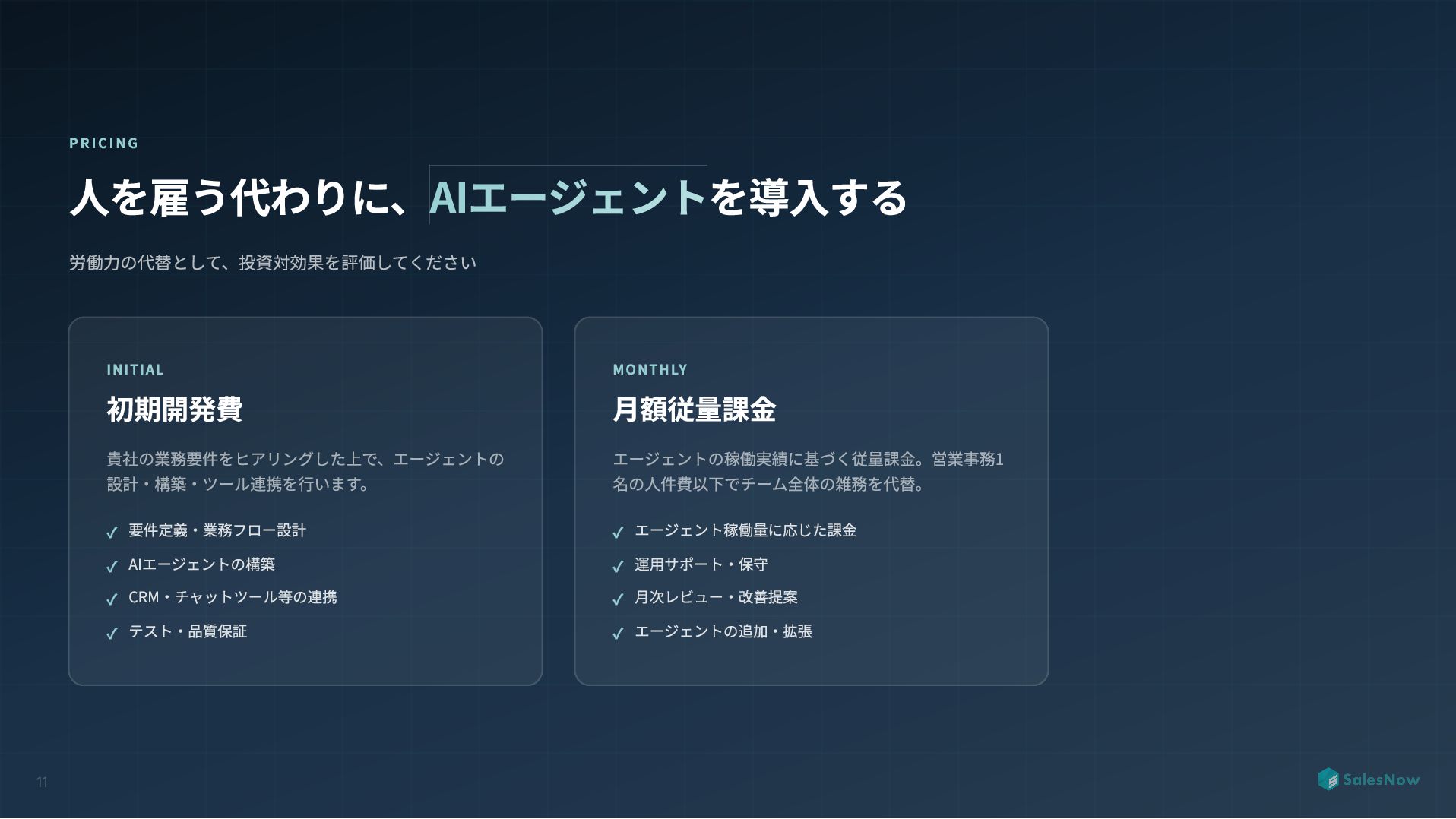 ✓ 貴社固有の業務ルール・判断基準をAIに反映 ✓ テスト・品質保証を経て本番環境に稼働 ✓ 月次レビューで分析と改善を繰り返し、精度を向上 ヒアリング 業務課題の深掘り 設計・構築 ゼロベースで開発 テスト・稼働 品質保証して本番へ ⽉次レビュー 分析 改善 精度向上 成果が出るまで伴⾛ 10