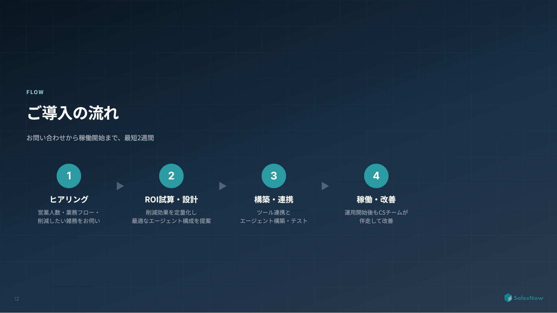 ✓ AIエージェントの構築 ✓ CRM・チャットツール等の連携 ✓ テスト・品質保証 MONTHLY 月額従量課金 エージェントの稼働実績に基づく従量課金。営業事務1 名の人件費以下でチーム全体の雑務を代替。 ✓ エージェント稼働量に応じた課金 ✓ 運用サポート・保守 ✓ 月次レビュー・改善提案 ✓ エージェントの追加・拡張 11
