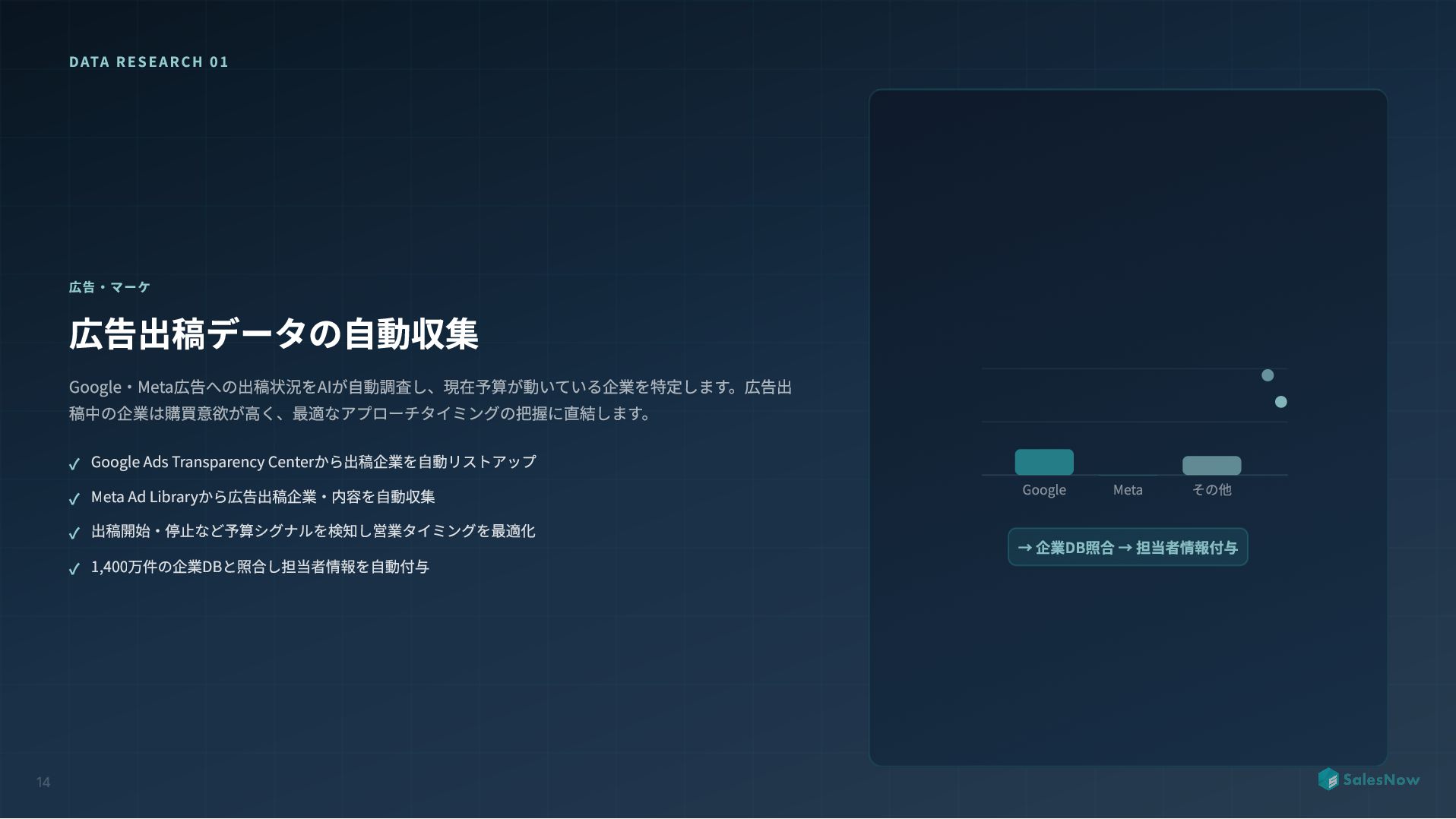 13. DATA RESEARCH 03 人材・派遣 派遣先企業データの自動収集 派遣求人サイトに掲載されている求人情報の勤務地・業務内容・条件から派遣先企業をAIが推測。通 常は非公開の派遣先企業を特定し、新規開拓リストとして活用できます。 ✓ 勤務地・最寄り駅・ビル名から派遣先企業をAIが推測 ✓