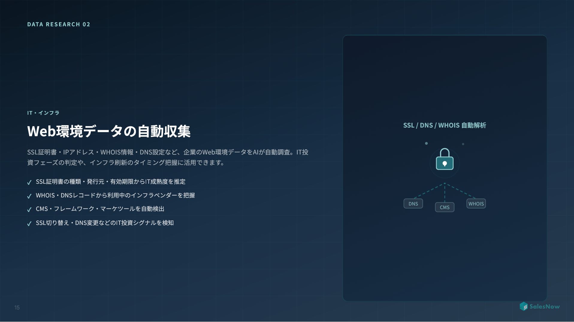 12. DATA RESEARCH 02 IT・インフラ Web環境データの自動収集 SSL証明書・IPアドレス・WHOIS情報・DNS設定など、企業のWeb環境データをAIが自動調査。IT投 資フェーズの判定や、インフラ刷新のタイミング把握に活用できます。 ✓ SSL証明書の種類・発行元・有効期限からIT成熟度を推定 ✓