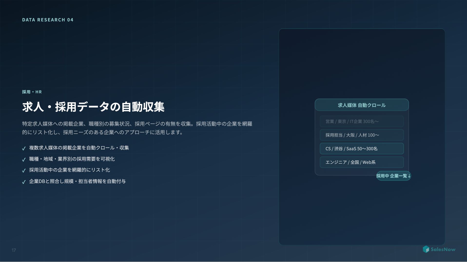 業務内容・スキルセットから業界・職種を特定 ✓ SalesNow企業DBと照合し企業情報を自動付与 ✓ 職種別・地域別の派遣需要推移を可視化 求人票 勤務地: 渋谷区 業務: 営業事務 給与: 時給1,500円 AI 解析・推測 派遣先企業 ◦◦株式会社 売上: 50億 / 従業員: 300名 非公開の派遣先企業を特定 → 新規開拓リストに 16