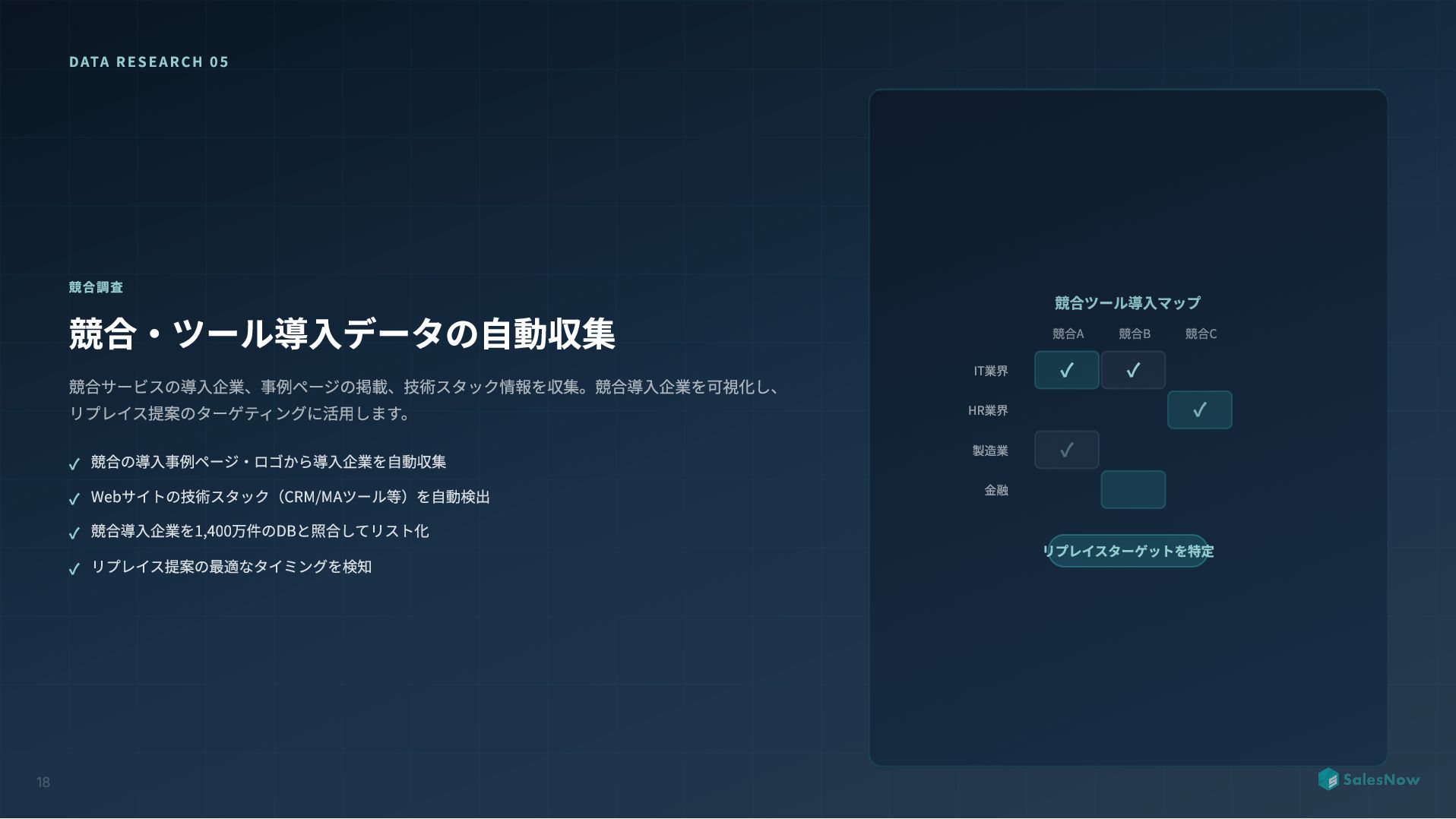 職種・地域・業界別の採用需要を可視化 ✓ 採用活動中の企業を網羅的にリスト化 ✓ 企業DBと照合し規模・担当者情報を自動付与 求人媒体 自動クロール 営業 / 東京 / IT企業 300名〜 採用担当 / 大阪 / 人材 100〜 CS / 渋谷 / SaaS 50〜300名 エンジニア / 全国 / Web系 採用中 企業一覧↓ 17