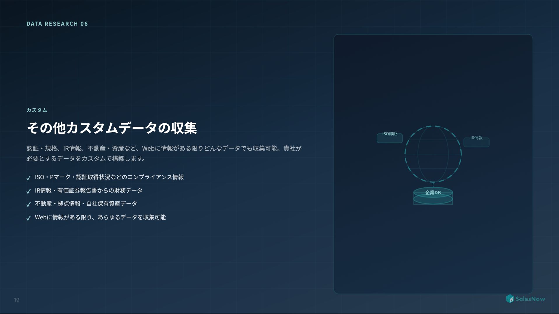 Web環境データ SSL証明書・WHOIS情報から、IT投資フェーズや担当ベンダ ーを読む 人材・派遣 派遣先企業データ 派遣求人の内容から、非公開の派遣先企業を推測し企業デー タを付与 採用・HR 求人・採用データ 特定求人媒体への掲載企業、職種別の募集状況を網羅的に収 集 競合調査 競合・ツール導入データ 競合サービスの導入企業、事例ページ掲載、技術スタック情 報を収集 カスタム その他なんでも 認証・規格、IR情報、不動産など Webに情報がある限り収集 可能 上記はあくまで一例です。貴社が必要とするどんなデータでもカスタムで構築可能です。 05