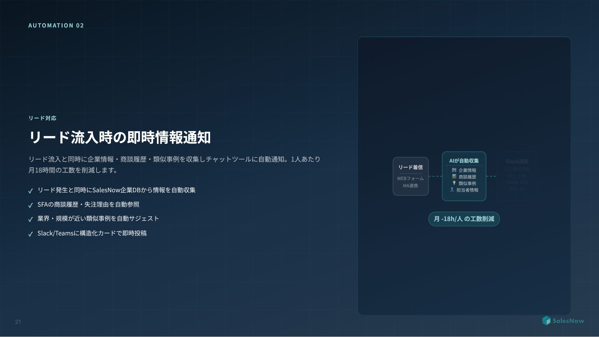 16. AUTOMATION 02 リード対応 リード流入時の即時情報通知 リード流入と同時に企業情報・商談履歴・類似事例を収集しチャットツールに自動通知。1人あたり 月18時間の工数を削減します。 ✓ リード発生と同時にSalesNow企業DBから情報を自動収集 ✓ SFAの商談履歴・失注理由を自動参照