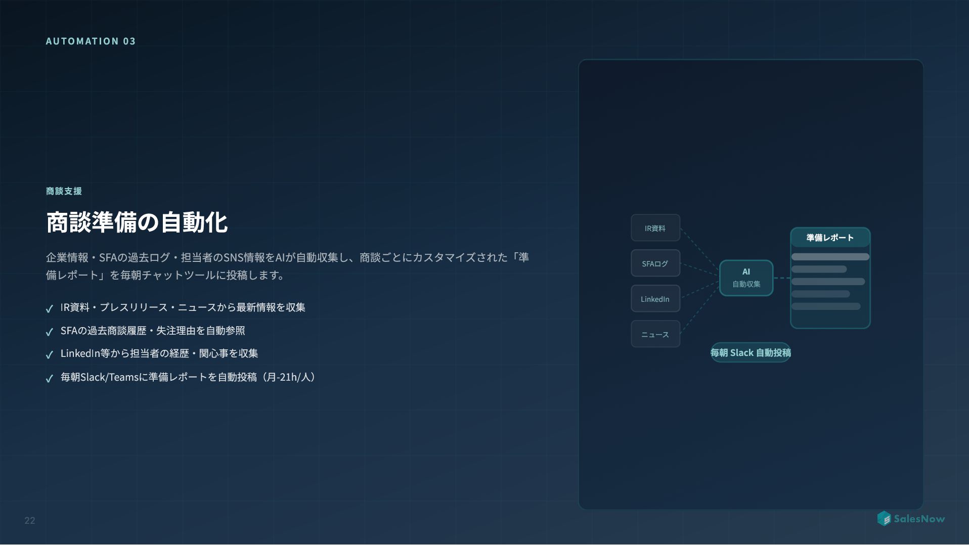 ✓ 業界・規模が近い類似事例を自動サジェスト ✓ Slack/Teamsに構造化カードで即時投稿 リード着信 WEBフォーム MA連携 AIが自動収集 🏢 企業情報 📊 商談履歴 💡 類似事例 👤 担当者情報 Slack通知 ◦◦株式会社 売上: 10億 従業員: 80名 類似: 3社 月 -18h/人 の工数削減 21