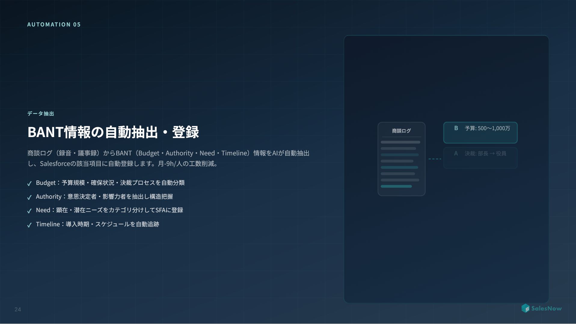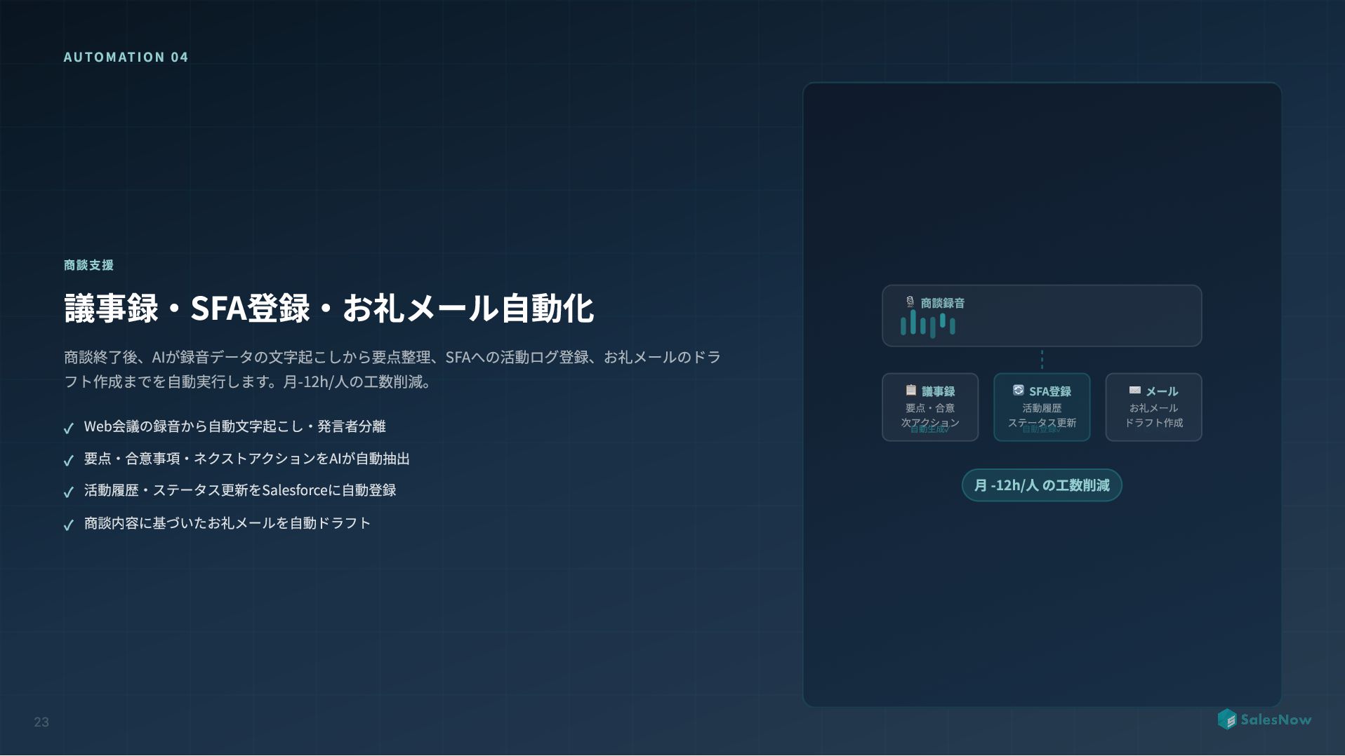 ✓ 活動履歴・ステータス更新をSalesforceに自動登録 ✓ 商談内容に基づいたお礼メールを自動ドラフト 🎙 商談録音 📋 議事録 要点・合意 次アクション 自動生成✓ 🔄 SFA登録 活動履歴 ステータス更新 自動登録✓ ✉️ メール お礼メール ドラフト作成 自動作成✓ 月 -12h/人 の工数削減 23