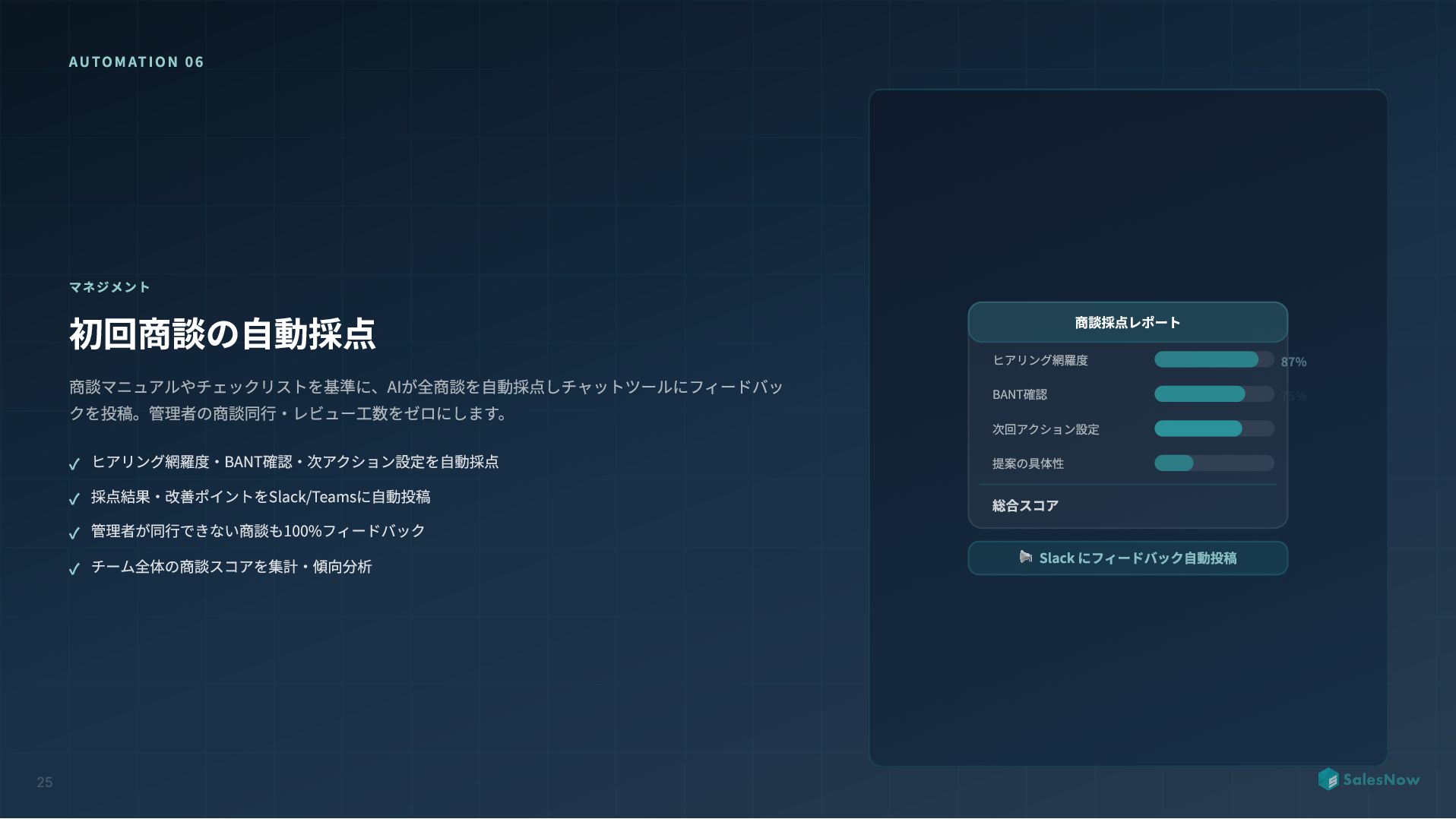 ✓ 管理者が同行できない商談も100%フィードバック ✓ チーム全体の商談スコアを集計・傾向分析 商談採点レポート ヒアリング網羅度 87% BANT確認 75% 次回アクション設定 提案の具体性 総合スコア 📢 Slack にフィードバック自動投稿 25