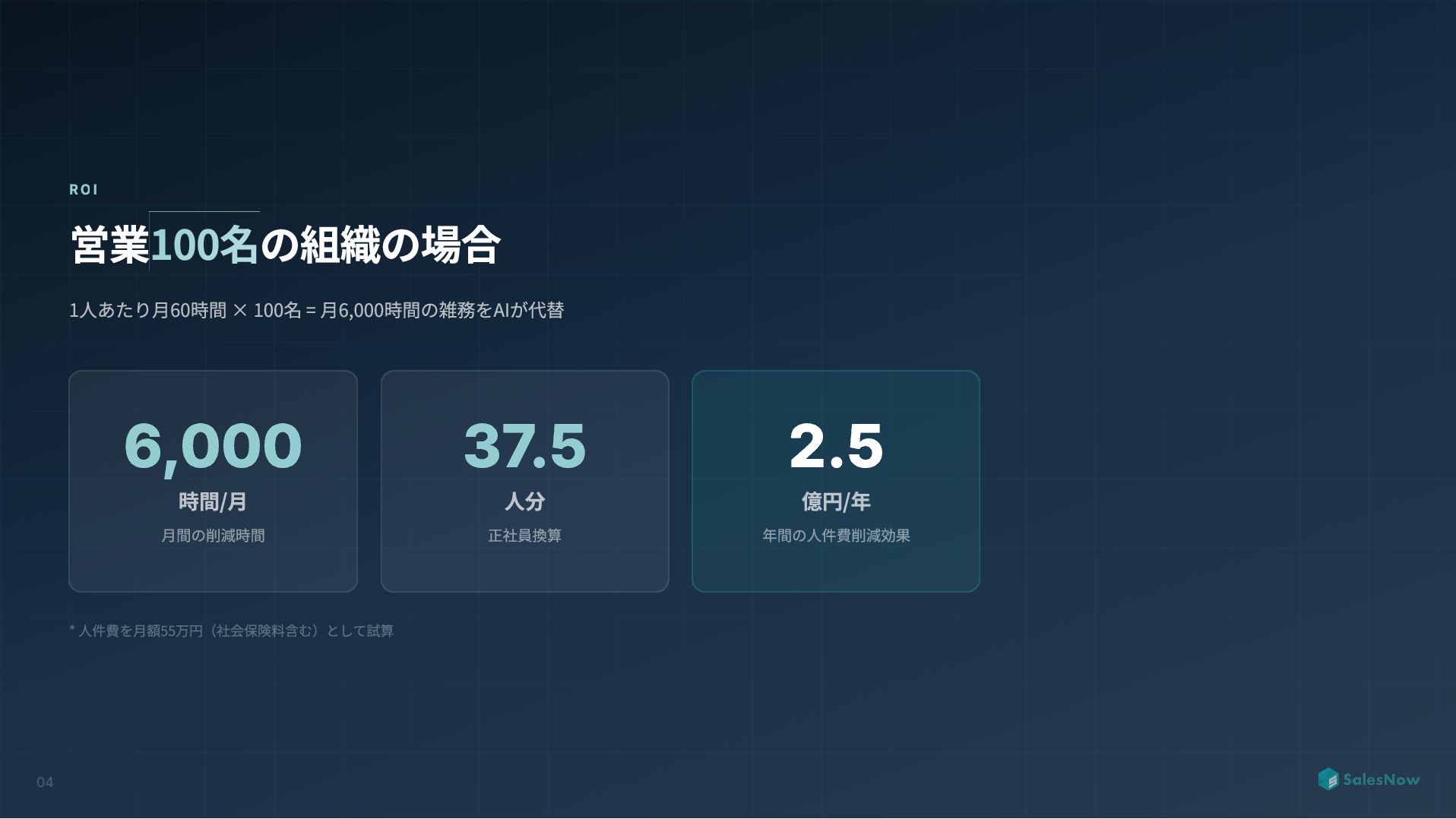 3. ROI 営業100名 100名の組織の場合 1人あたり月60時間 × 100名 = 月6,000時間の雑務をAIが代替 6,000 月間の削減時間