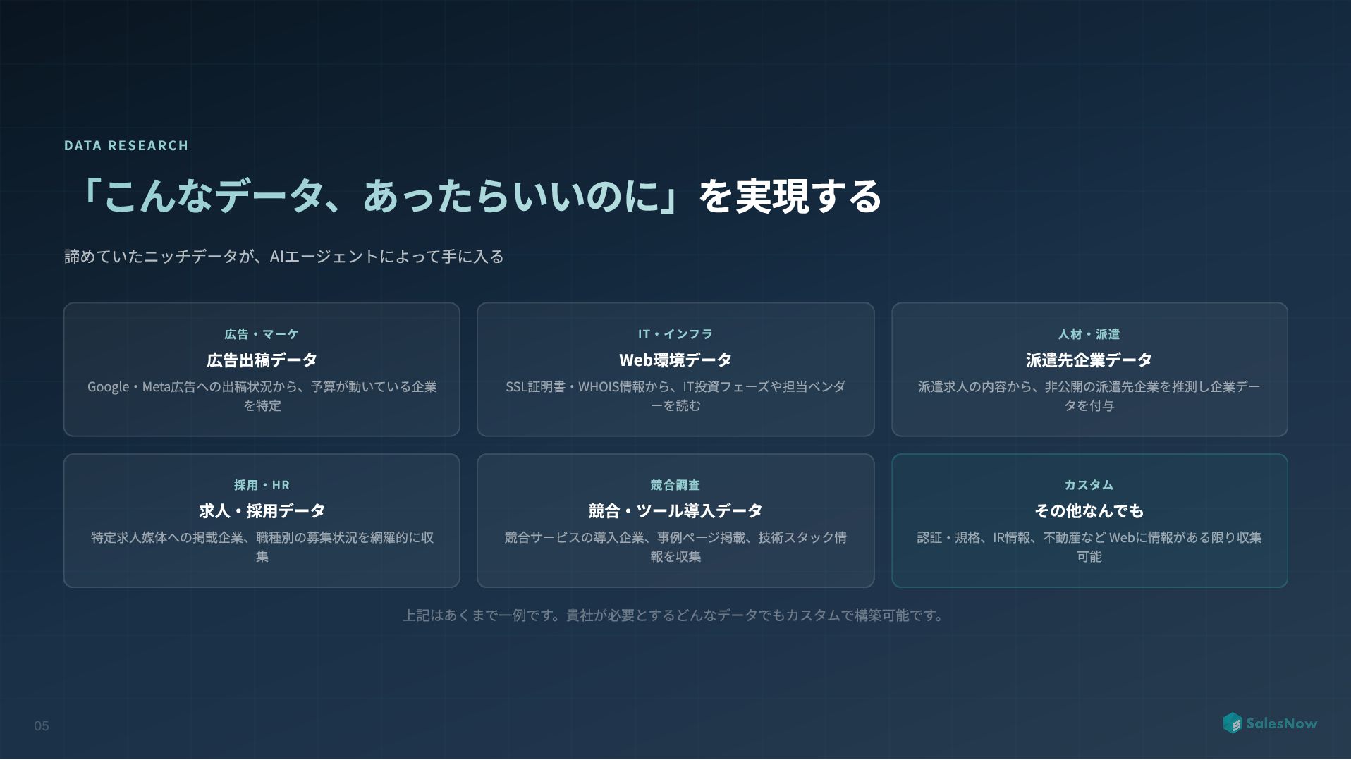 4. DATA RESEARCH 「こんなデータ、あったらいいのに」 「こんなデータ、あったらいいのに」を実現する 諦めていたニッチデータが、AIエージェントによって手に入る 広告・マーケ 広告出稿データ Google・Meta広告への出稿状況から、予算が動いている企業 を特定 IT・インフラ