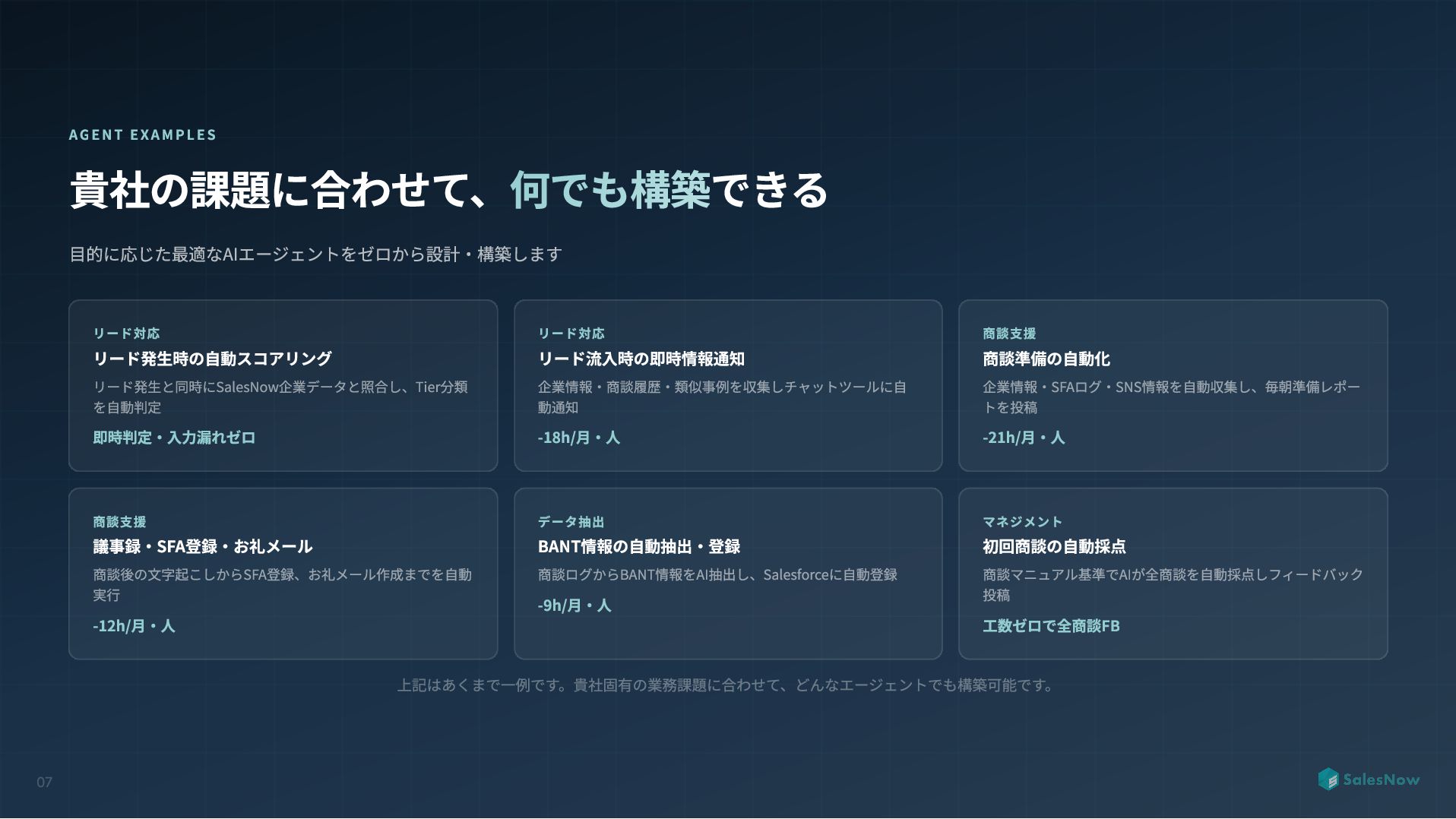6. AGENT EXAMPLES 貴社の課題に合わせて、何でも構築 何でも構築できる 目的に応じた最適なAIエージェントをゼロから設計・構築します リード対応 リード発生時の自動スコアリング リード発生と同時にSalesNow企業データと照合し、Tier分類 を自動判定 即時判定・入力漏れゼロ
