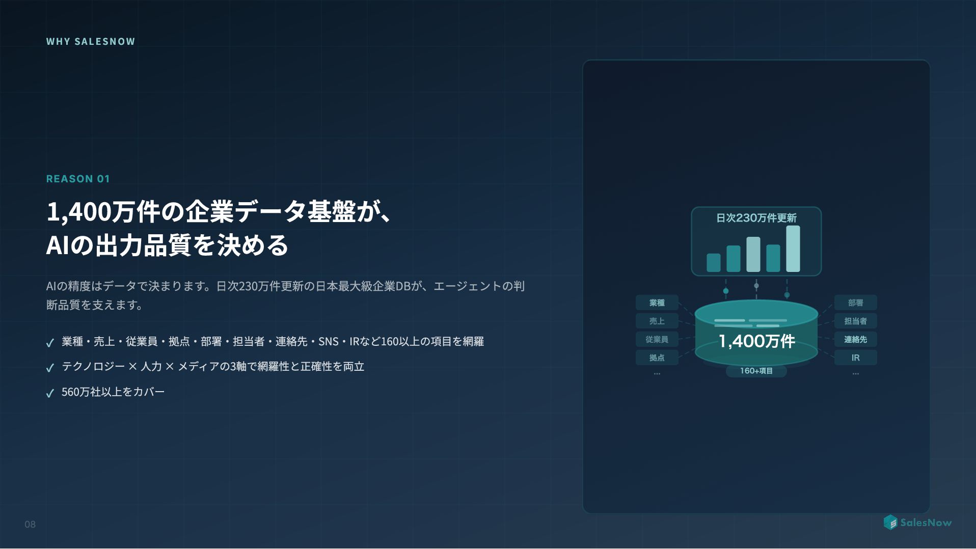 リード対応 リード流入時の即時情報通知 企業情報・商談履歴・類似事例を収集しチャットツールに自 動通知 -18h/月・人 商談支援 商談準備の自動化 企業情報・SFAログ・SNS情報を自動収集し、毎朝準備レポー トを投稿 -21h/月・人 商談支援 議事録・SFA登録・お礼メール 商談後の文字起こしからSFA登録、お礼メール作成までを自動 実行 -12h/月・人 データ抽出 BANT情報の自動抽出・登録 商談ログからBANT情報をAI抽出し、Salesforceに自動登録 -9h/月・人 マネジメント 初回商談の自動採点 商談マニュアル基準でAIが全商談を自動採点しフィードバック 投稿 工数ゼロで全商談FB 上記はあくまで一例です。貴社固有の業務課題に合わせて、どんなエージェントでも構築可能です。 07