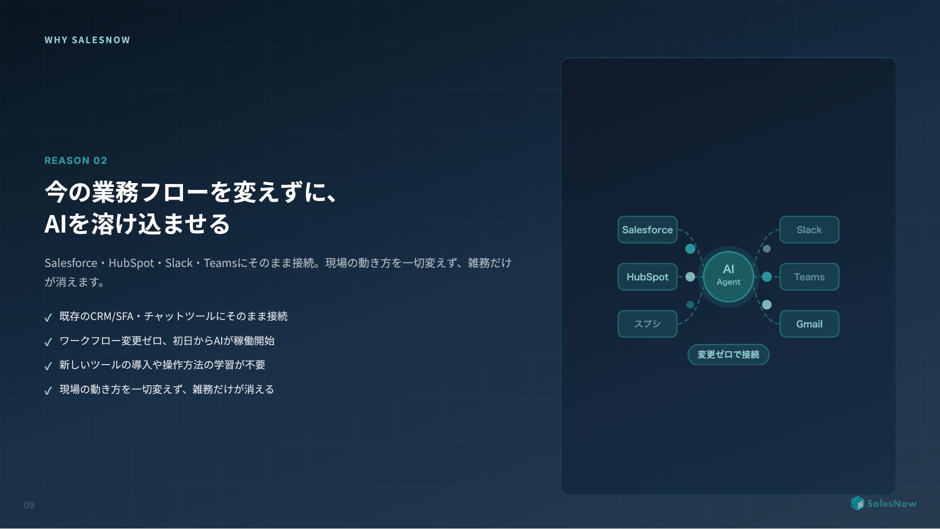 7. WHY SALESNOW REASON 02 今の業務フローを変えずに、 AIを溶け込ませる Salesforce・HubSpot・Slack・Teamsにそのまま接続。現場の動き方を一切変えず、雑務だけ が消えます。 ✓ 既存のCRM/SFA・チャットツールにそのまま接続