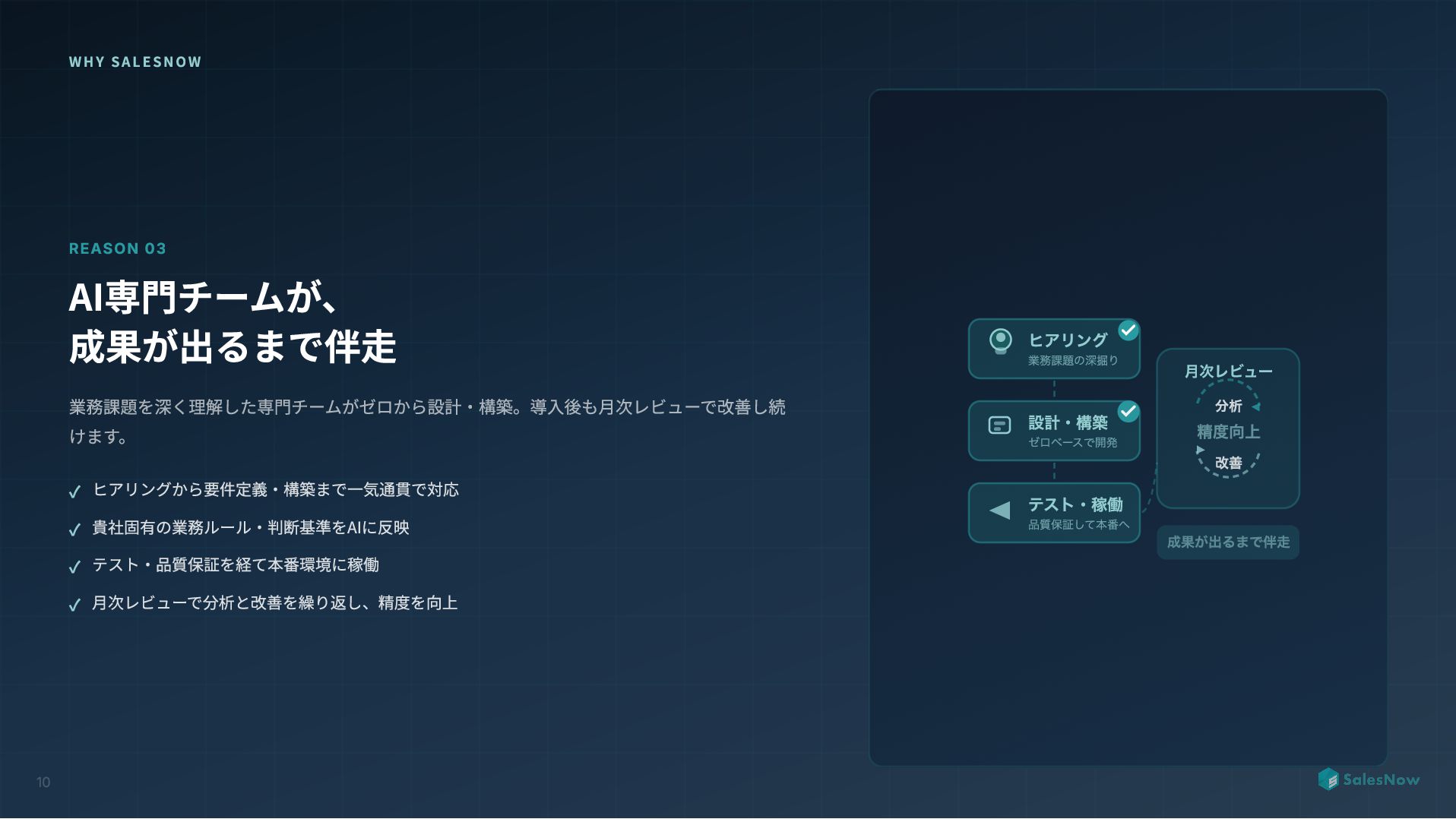 8. WHY SALESNOW REASON 03 AI専門チームが、 成果が出るまで伴走 業務課題を深く理解した専門チームがゼロから設計・構築。導入後も月次レビューで改善し続 けます。 ✓ ヒアリングから要件定義・構築まで一気通貫で対応