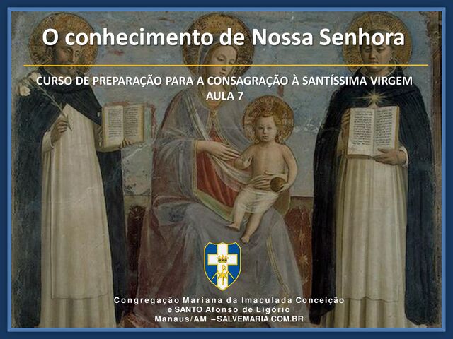 Lombaerde Glórias de Maria – Santo Afonso de Ligório Tratado da Verdadeira Devoção – São Luís Maria G. de Montfort A Virgem Maria – Santo Agostinho Referências CONGREGAÇÃO MARIANA DA IMACULADA CONCEIÇÃO E S. AFONSO DE LIGÓRIO – MANAUS/AM salvemaria.com.br Curso de Consagração – Conhecimento de Nossa Senhora