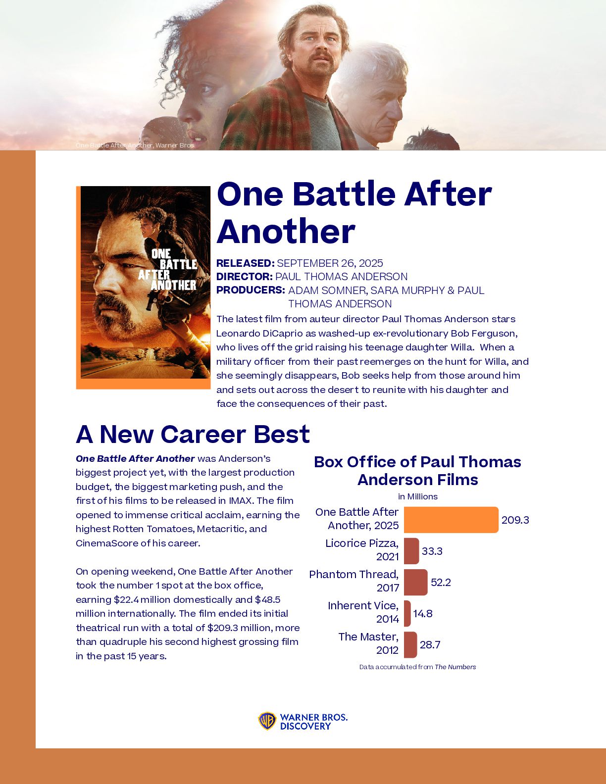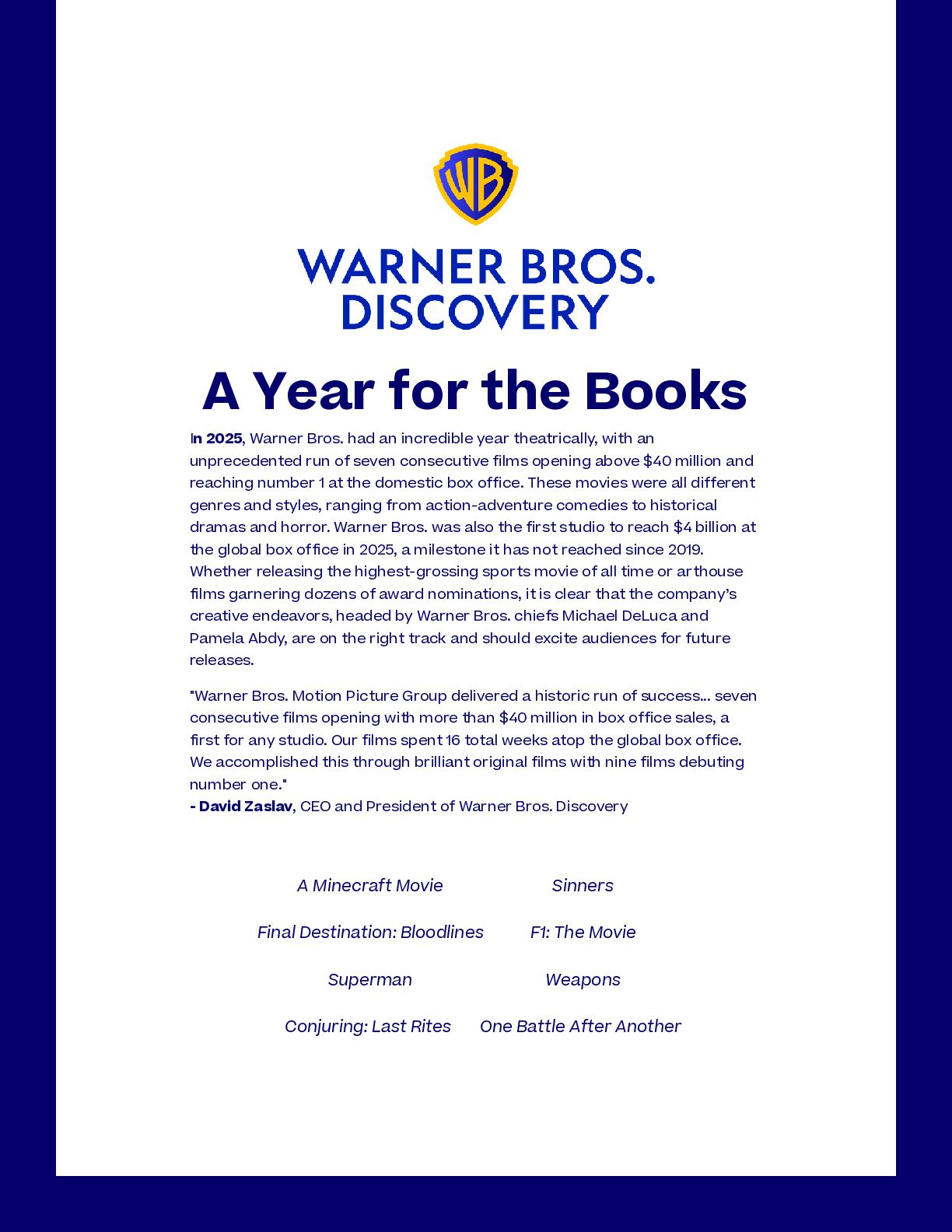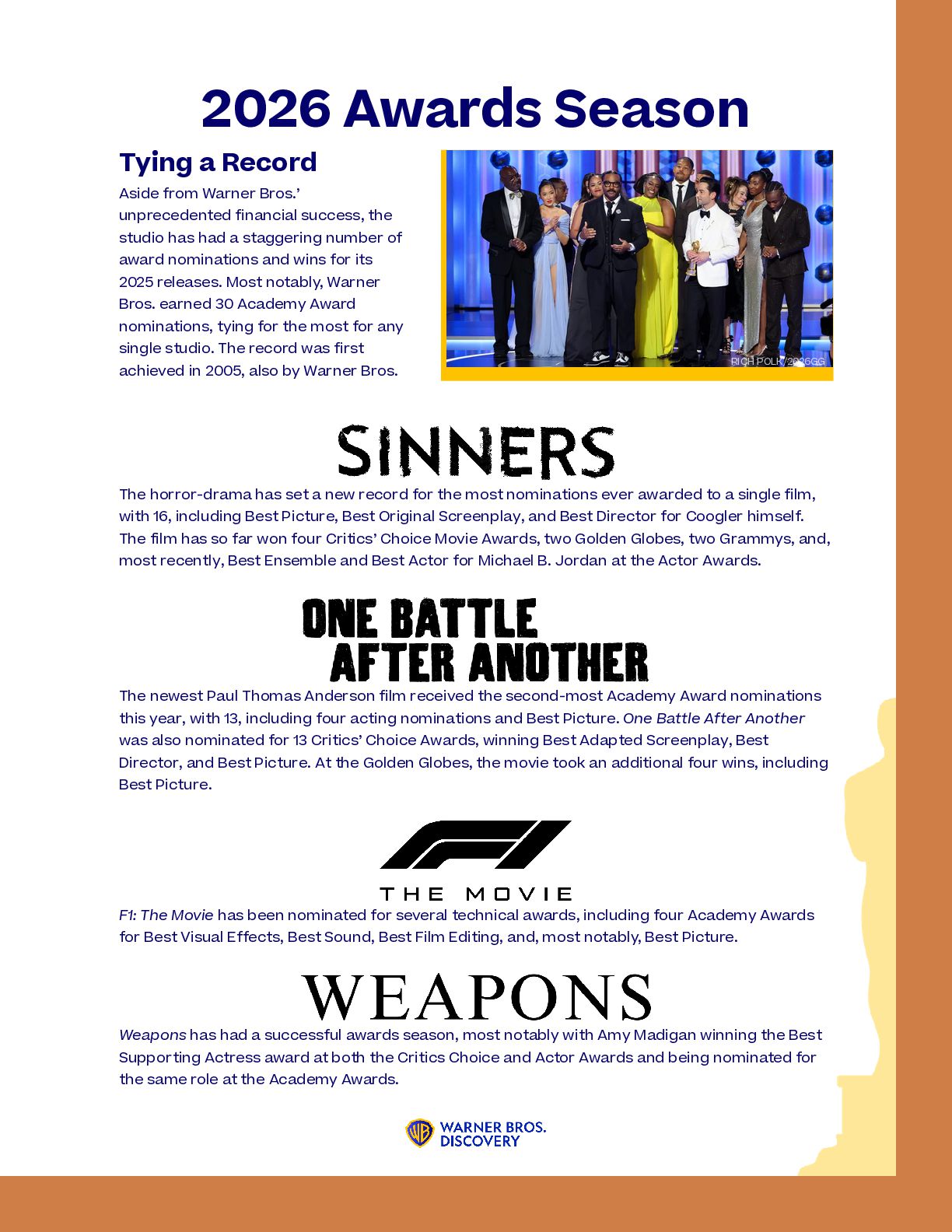 nominations ever awarded to a single film, with 16, including Best Picture, Best Original Screenplay, and Best Director for Coogler himself. The film has so far won four Critics’ Choice Movie Awards, two Golden Globes, two Grammys, and, most recently, Best Ensemble and Best Actor for Michael B. Jordan at the Actor Awards. F1: The Movie has been nominated for several technical awards, including four Academy Awards for Best Visual Effects, Best Sound, Best Film Editing, and, most notably, Best Picture. 2026 Awards Season Aside from Warner Bros.’ unprecedented financial success, the studio has had a staggering number of award nominations and wins for its 2025 releases. Most notably, Warner Bros. earned 30 Academy Award nominations, tying for the most for any single studio. The record was first achieved in 2005, also by Warner Bros. The newest Paul Thomas Anderson film received the second-most Academy Award nominations this year, with 13, including four acting nominations and Best Picture. One Battle After Another was also nominated for 13 Critics’ Choice Awards, winning Best Adapted Screenplay, Best Director, and Best Picture. At the Golden Globes, the movie took an additional four wins, including Best Picture. Tying a Record Weapons has had a successful awards season, most notably with Amy Madigan winning the Best Supporting Actress award at both the Critics Choice and Actor Awards and being nominated for the same role at the Academy Awards. RICH POLK/2026GG