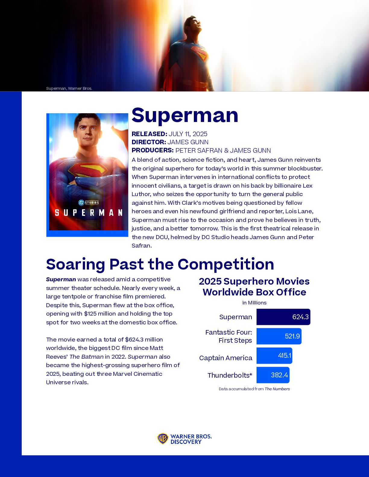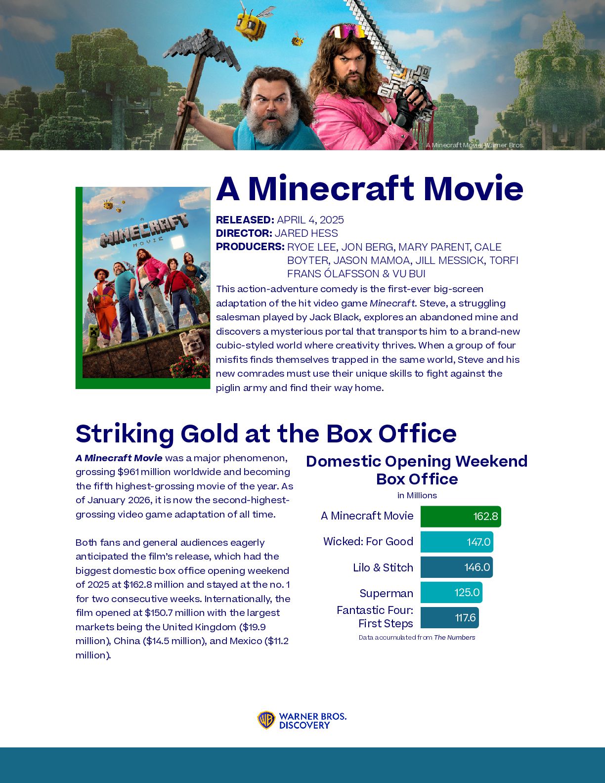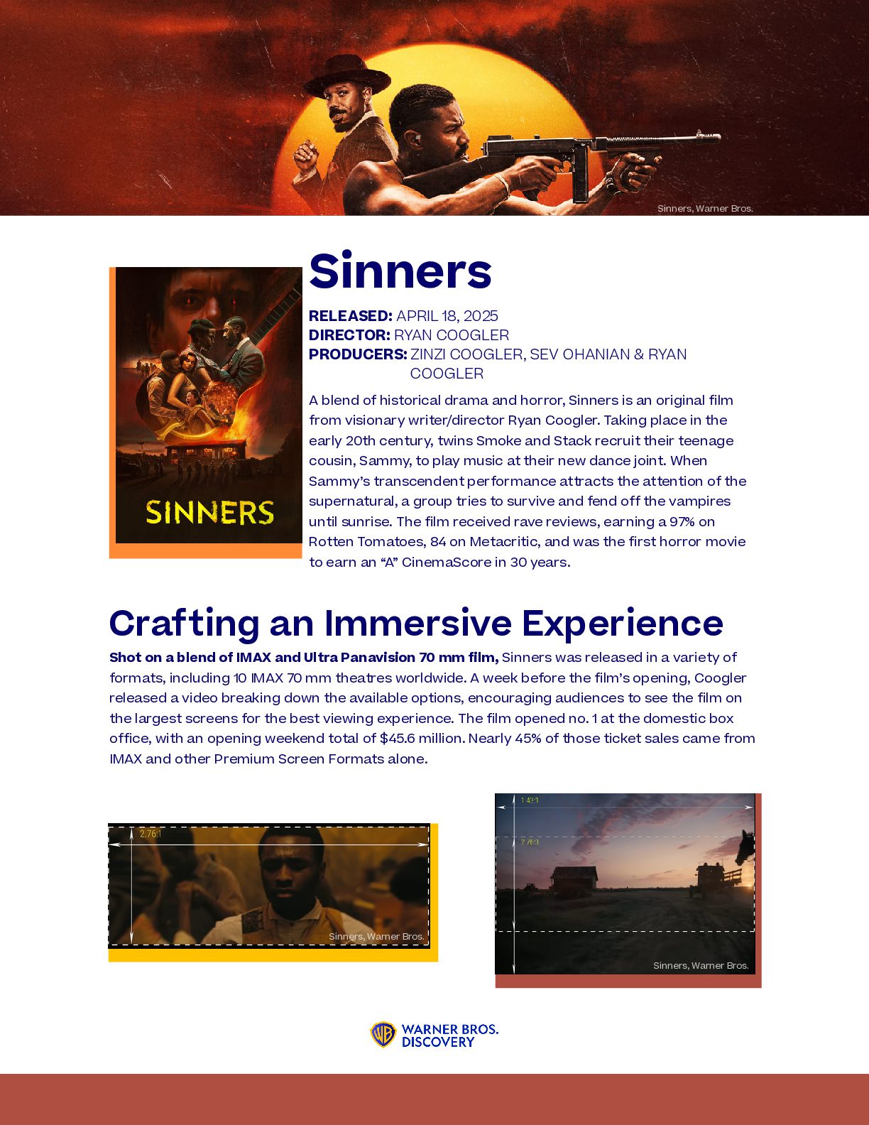 nominations ever awarded to a single film, with 16, including Best Picture, Best Original Screenplay, and Best Director for Coogler himself. The film has so far won four Critics’ Choice Movie Awards, two Golden Globes, two Grammys, and, most recently, Best Ensemble and Best Actor for Michael B. Jordan at the Actor Awards. F1: The Movie has been nominated for several technical awards, including four Academy Awards for Best Visual Effects, Best Sound, Best Film Editing, and, most notably, Best Picture. 2026 Awards Season Aside from Warner Bros.’ unprecedented financial success, the studio has had a staggering number of award nominations and wins for its 2025 releases. Most notably, Warner Bros. earned 30 Academy Award nominations, tying for the most for any single studio. The record was first achieved in 2005, also by Warner Bros. The newest Paul Thomas Anderson film received the second-most Academy Award nominations this year, with 13, including four acting nominations and Best Picture. One Battle After Another was also nominated for 13 Critics’ Choice Awards, winning Best Adapted Screenplay, Best Director, and Best Picture. At the Golden Globes, the movie took an additional four wins, including Best Picture. Tying a Record Weapons has had a successful awards season, most notably with Amy Madigan winning the Best Supporting Actress award at both the Critics Choice and Actor Awards and being nominated for the same role at the Academy Awards. RICH POLK/2026GG