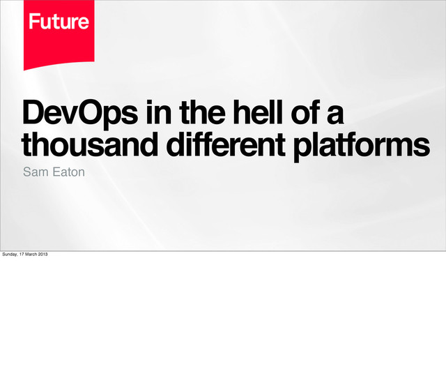 Future: http://futureplc.com/ • Future DevOps Blog: http://ops.failcake.net/ • Contact me: [email protected], @thesamoth Sunday, 17 March 2013 To help others out of hell, we’ve open sourced a lot of the tools we’ve built along the road I hope seeing some of our journey has been useful for you Thank you - Any questions?
