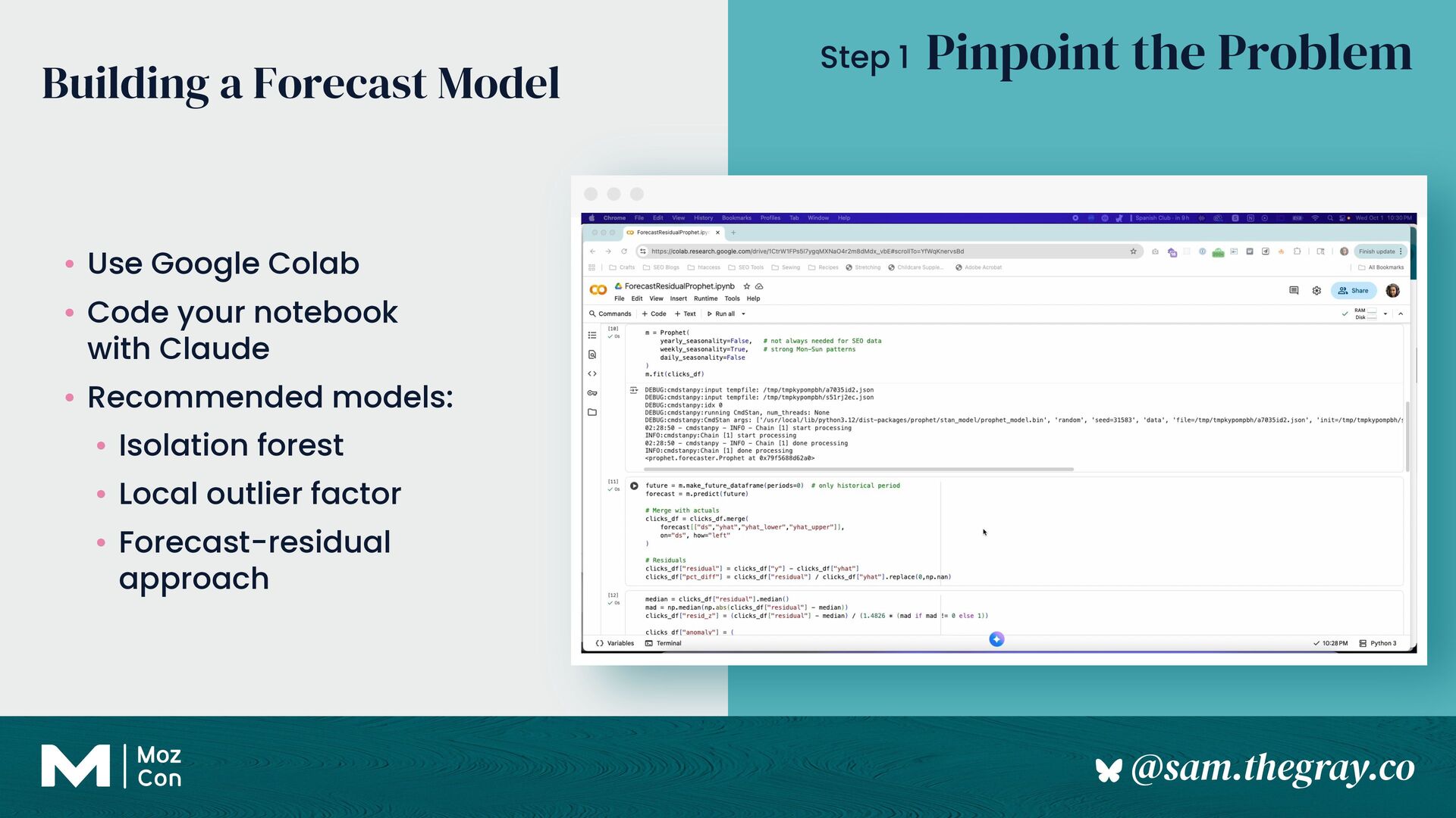 Use Google Colab • Code your notebook with Claude • Recommended models: • Isolation forest • Local outlier factor • Forecast-residual approach