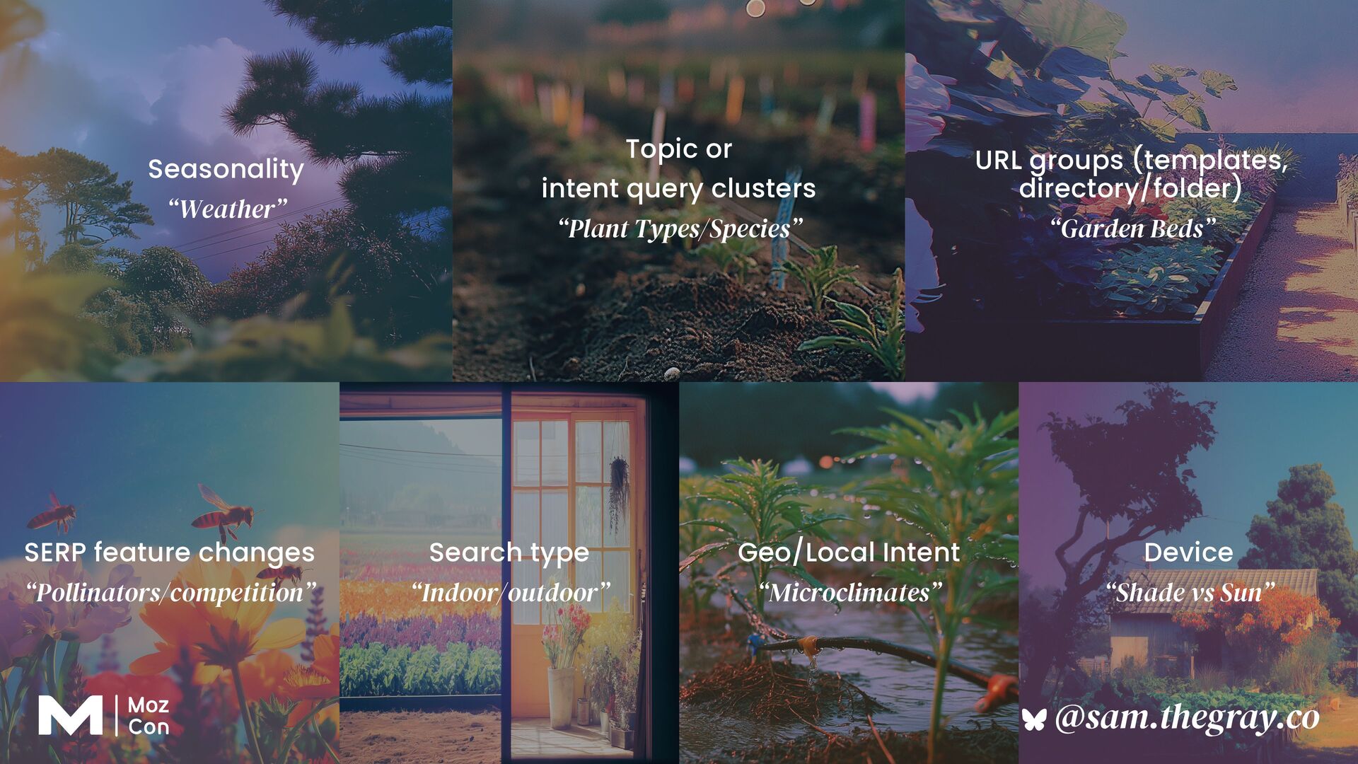 groups (templates, directory/folder) “Garden Beds” SERP feature changes “Pollinators/competition” Search type “Indoor/outdoor” Geo/Local Intent “Microclimates” Device “Shade vs Sun”