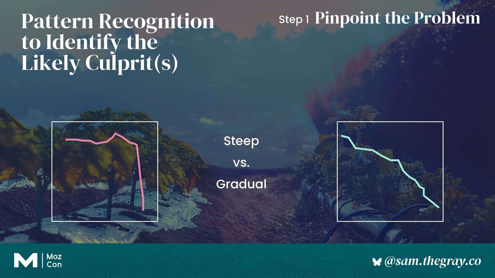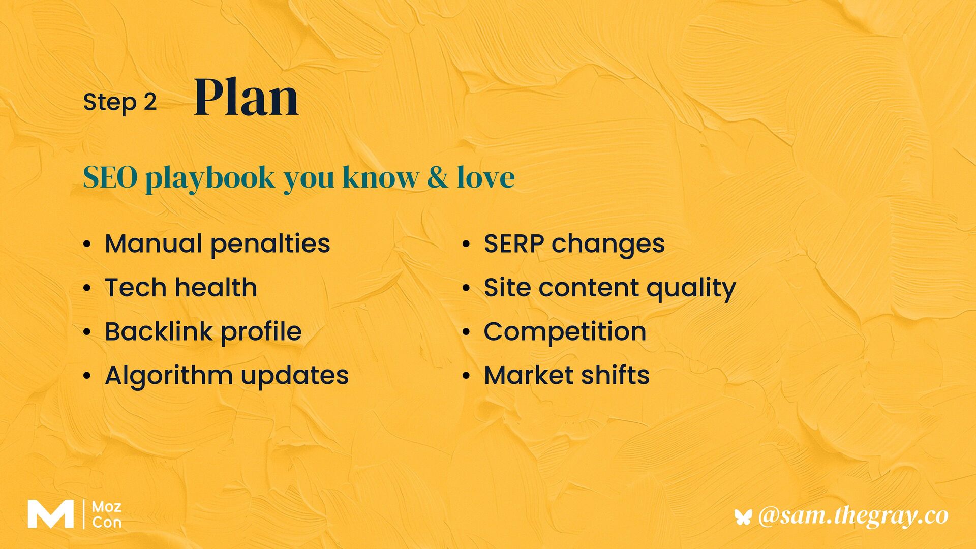 Manual penalties • Tech health • Backlink profile • Algorithm updates • SERP changes • Site content quality • Competition • Market shifts