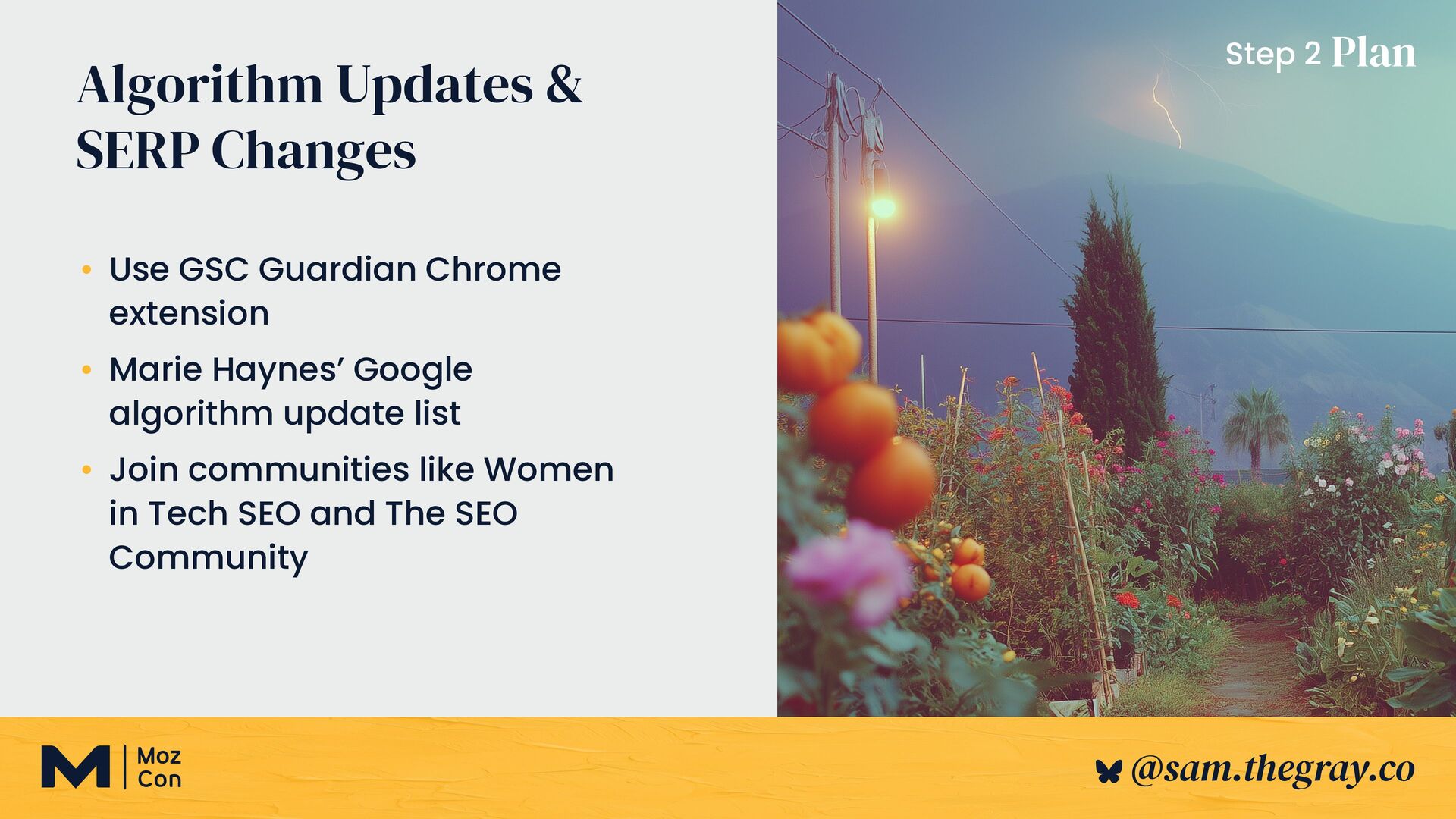 algorithm update list • Join communities like Women in Tech SEO and The SEO Community Algorithm Updates & SERP Changes Plan Step 2